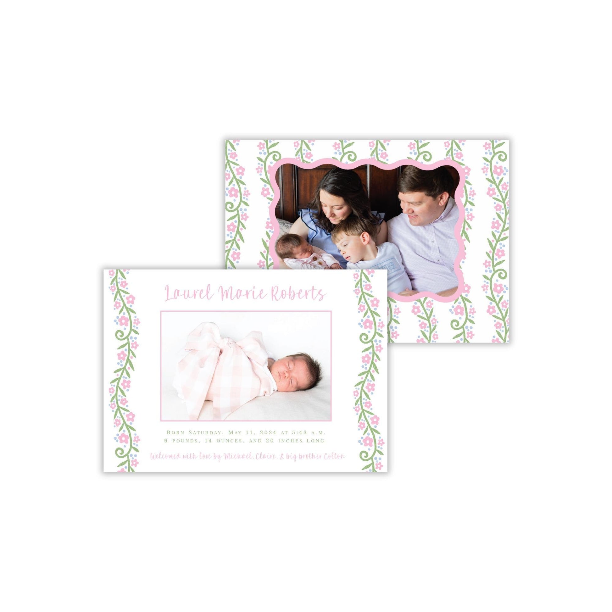 Announce your new little one in style with these baby girl birth announcement cards from Emilemon Paper Studio! Featuring lovely watercolor floral vines, these printed birth announcement cards are perfect for your new baby girl!