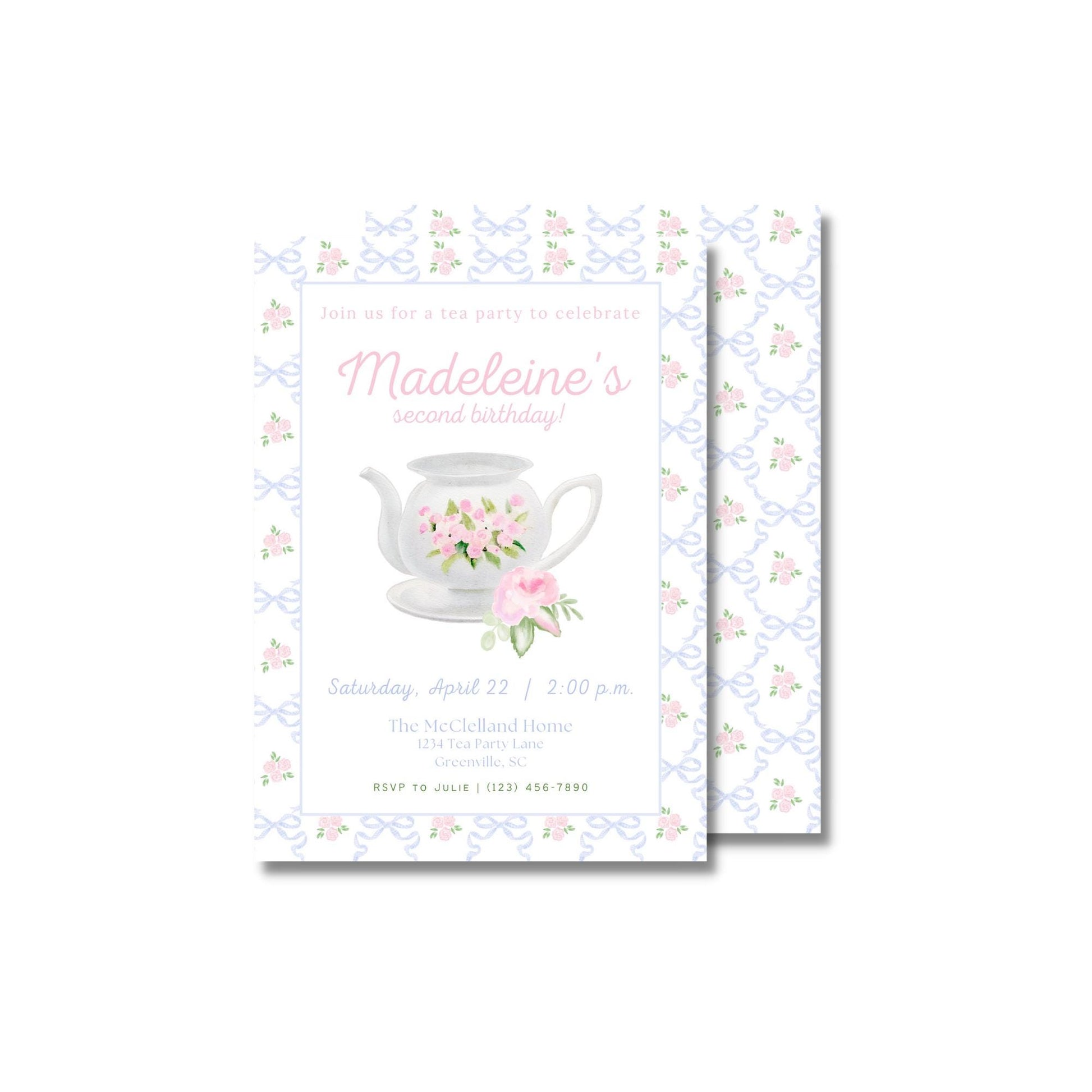 Celebrate your little lady with this classy Tea for Two birthday invitation from Emilemon Paper Studio! Featuring a watercolor style ribbon border with a teapot and roses, this tea party invitation is perfect for a first birthday, second birthday, baby shower, and more!