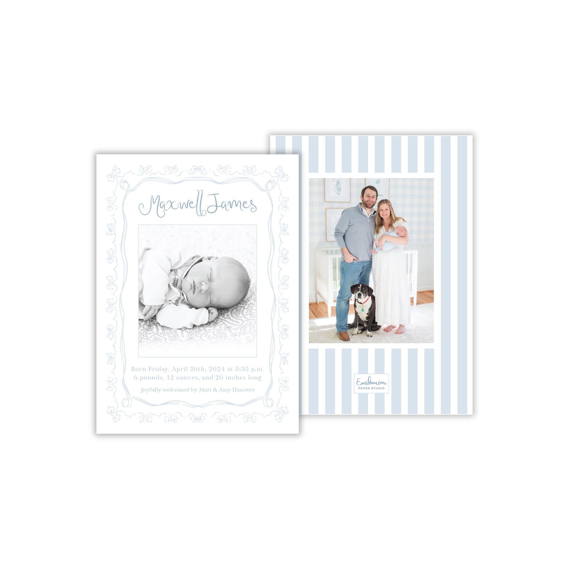 Announce your new little one in style with these stunning blue bow frame birth announcement cards for boys from Emilemon Paper Studio! Featuring an exclusive, hand-drawn border and a gorgeous script font, these photo cards are perfect for showing off your new baby boy!