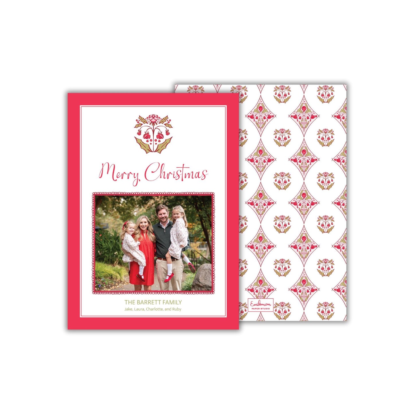 Send holiday greetings in style with these stunning Christmas holly personalized photo cards from Emilemon Paper Studio! Featuring exclusive, hand-drawn artwork from Sarah O'Mary Designs Collective, these watercolor patterned holiday cards are perfect for anyone who loves a pink Christmas!