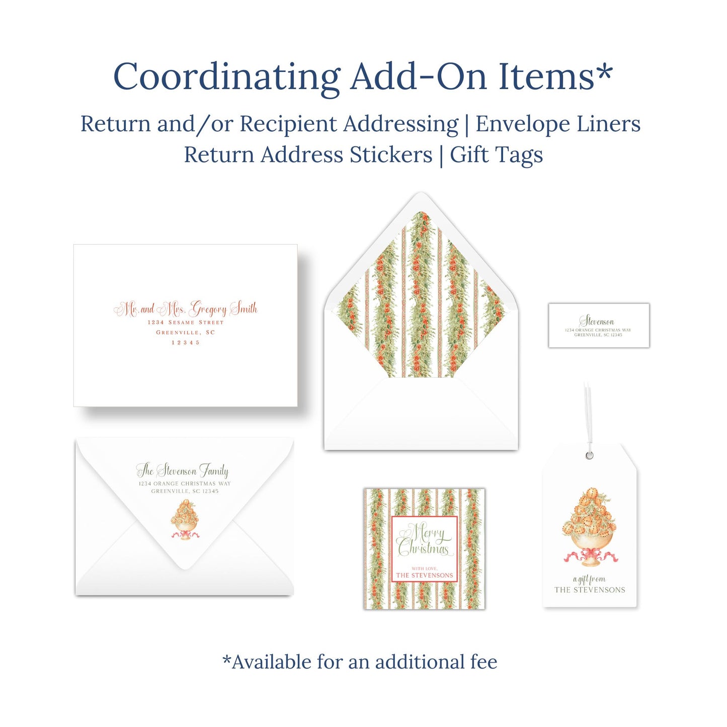 This Christmas card is sized 5x7, and printed on thick 120 lb eggshell cover cardstock. Cards come with matching white square-flap envelopes. If you would like any extras such as envelope liners or return/recipient addressing, please contact me to purchase the additional listing for those upgrades.