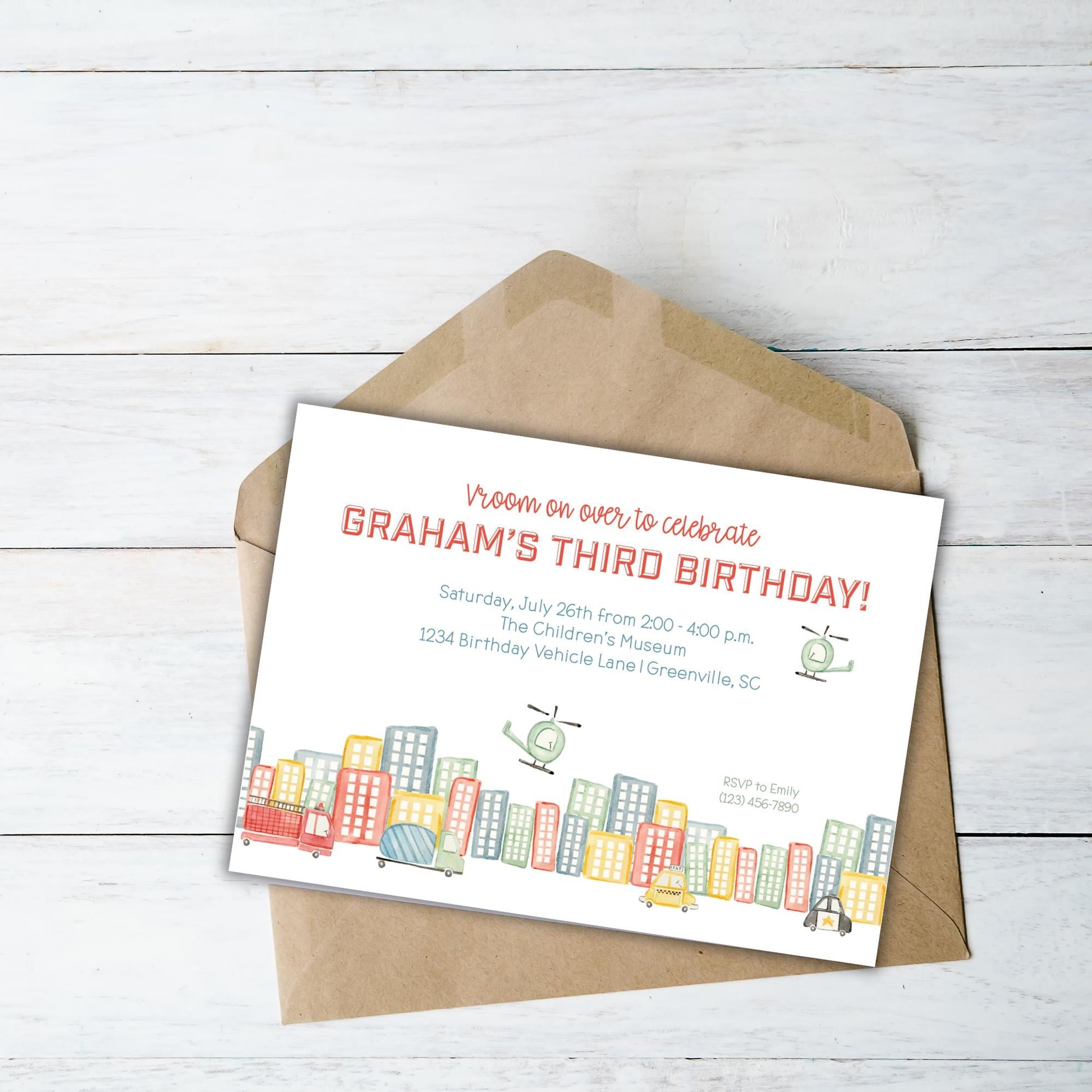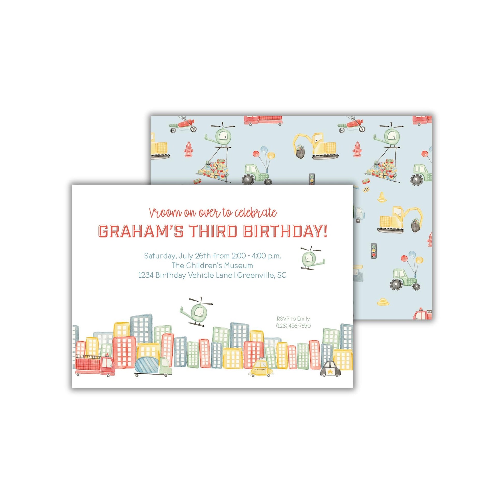 Celebrate your little one in style with this adorable city vehicle birthday party invitation from Emilemon Paper Studio! Featuring exclusive, hand-painted watercolor artwork, this "Things that Go" invitation is the perfect classic boy birthday invitation!