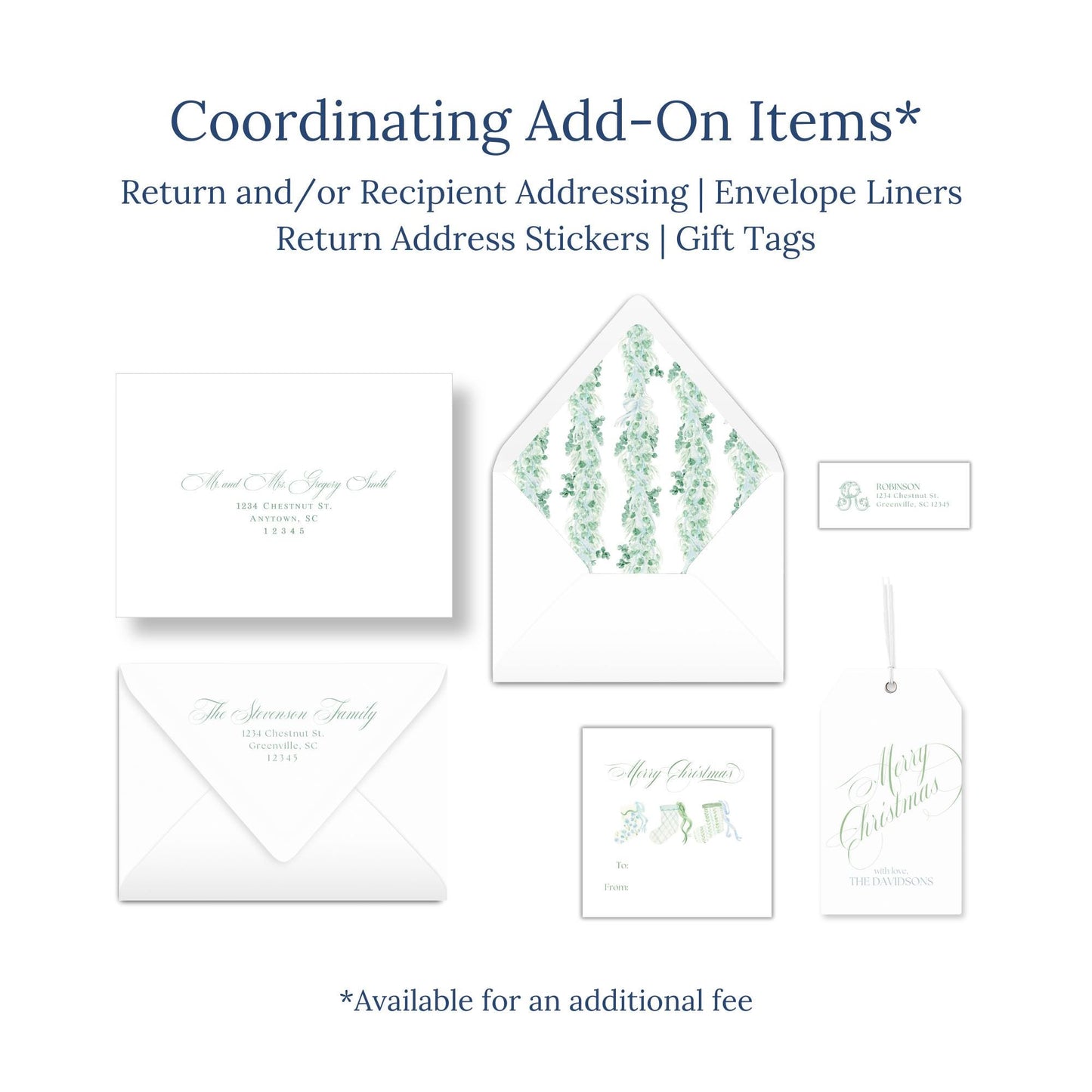 This Christmas card is sized 5x7, and printed on thick 120 lb eggshell cover cardstock. Cards come with matching white square-flap envelopes. If you would like any extras such as envelope liners or return/recipient addressing, please contact me to purchase the additional listing for those upgrades.