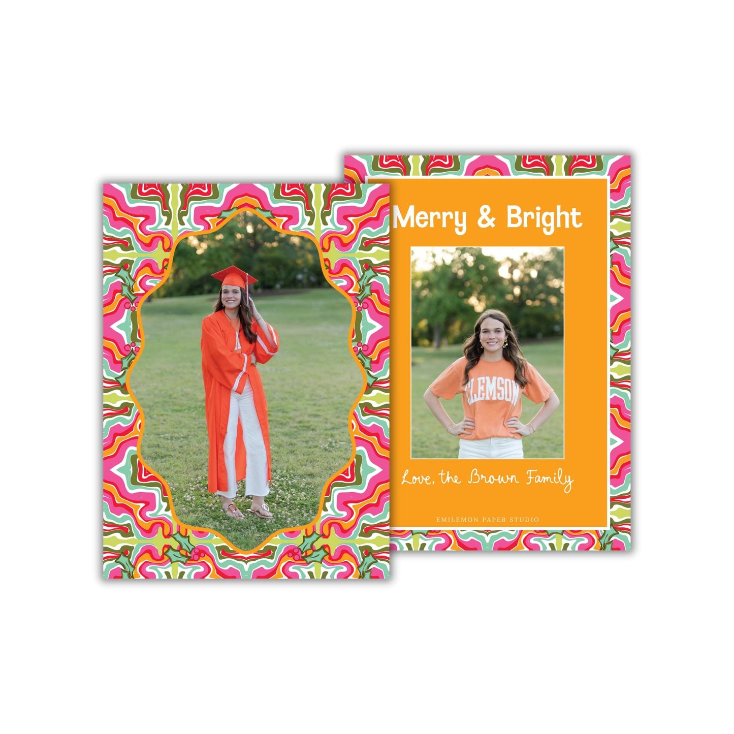 Send holiday greetings in style with these stunning colorful Christmas graduation photo cards from Emilemon Paper Studio! Featuring exclusive, hand-drawn artwork from Sarah O'Mary Designs Collective, these personalized pink and orange marble holiday cards are perfect for anyone who loves a colorful Christmas!