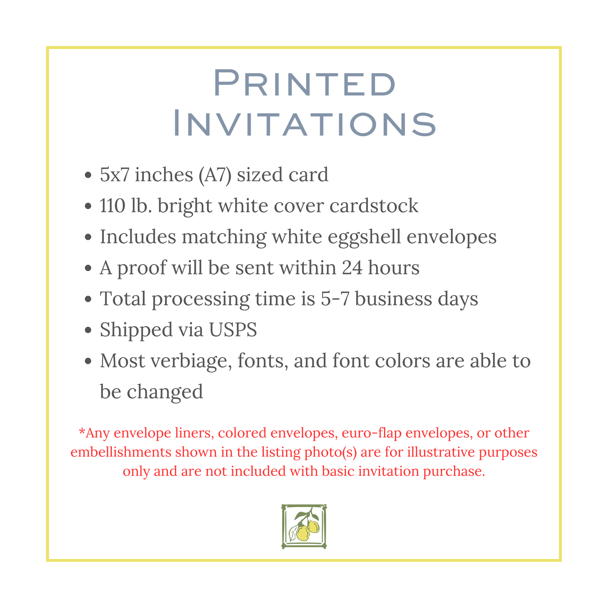 Printed invitations come on smooth bright white cover cardstock and come with matching white envelopes. If you would like any extras such as return addressing or envelope liners, please contact me for a custom quote.