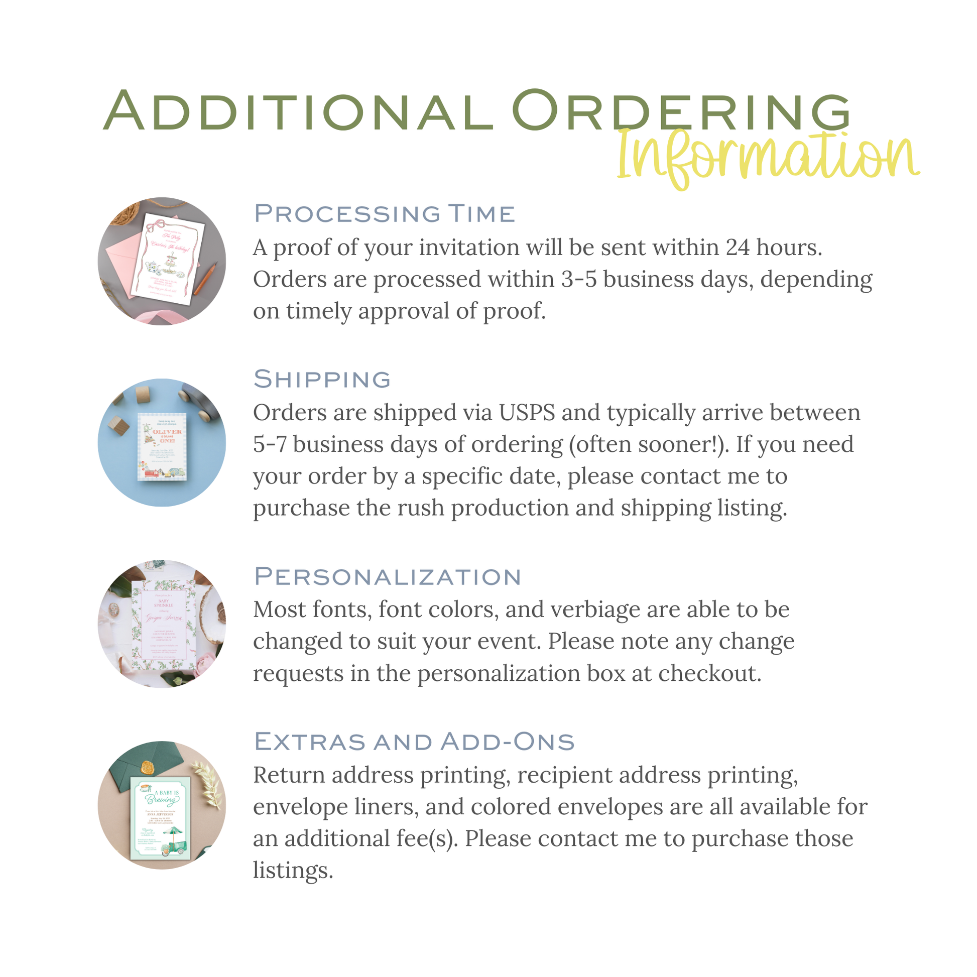 Once I receive all personalization info, I will email you a proof within 24 hours. After the proof has been approved, your invitation will be sent into production and then shipped directly to you.