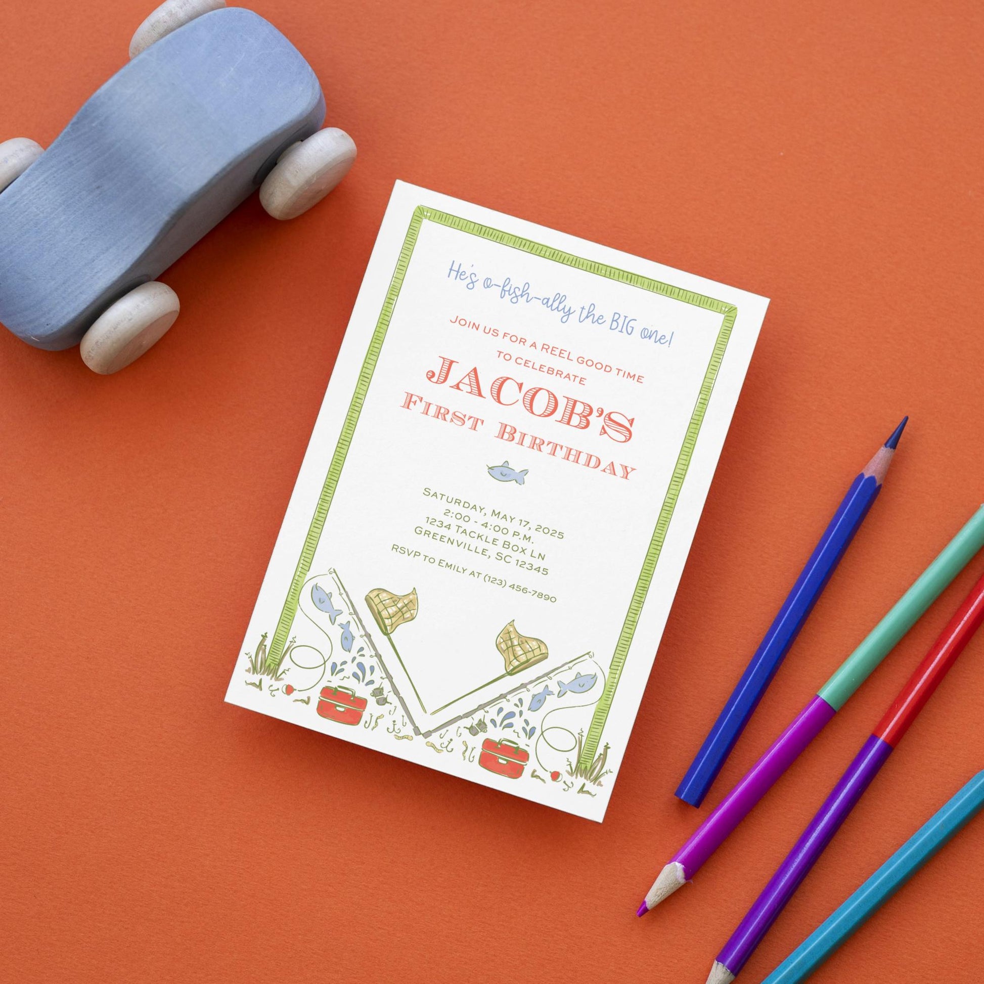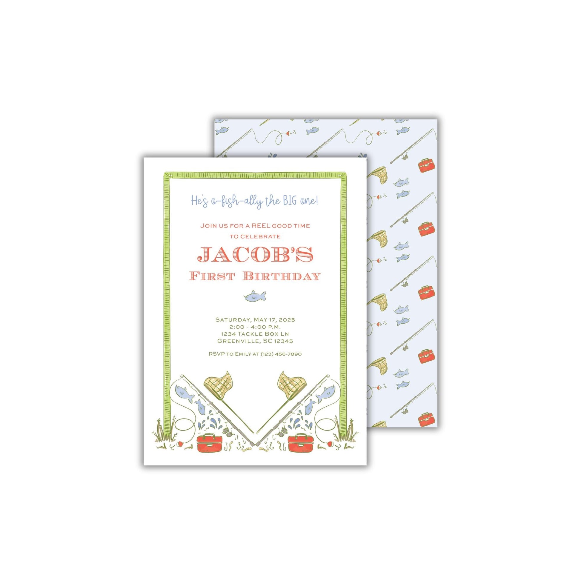 Celebrate in style with this fishing birthday party invitation from Emilemon Paper Studio! Featuring exclusive, hand-drawn artwork, this little boy first birthday invitation is perfect for your little angler who's "O-Fish-Ally turning the BIG One!"
