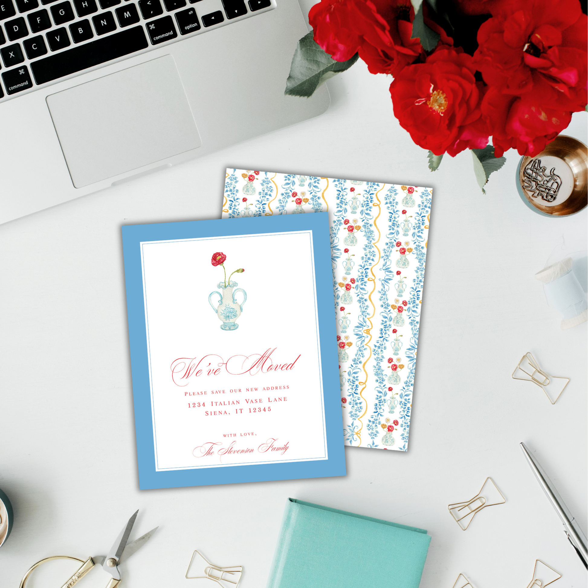 Make sure everyone knows your new address with these stunning floral vase change of address cards! Featuring exclusive, hand-painted watercolor artwork, these Italian-inspired moving announcements are perfect for anyone moving to Europe!