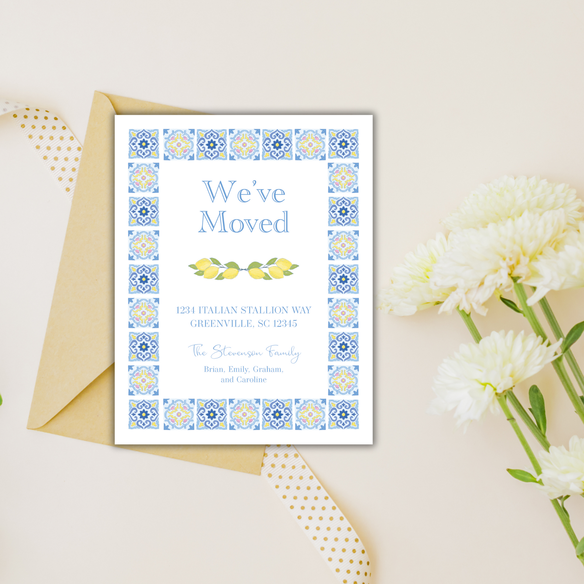 Make sure everyone knows your new address with these stunning Italian tile moving announcement cards! Featuring exclusive, hand-drawn artwork, these lemon new address cards with envelopes are the perfect way to let everyone know your change of address!