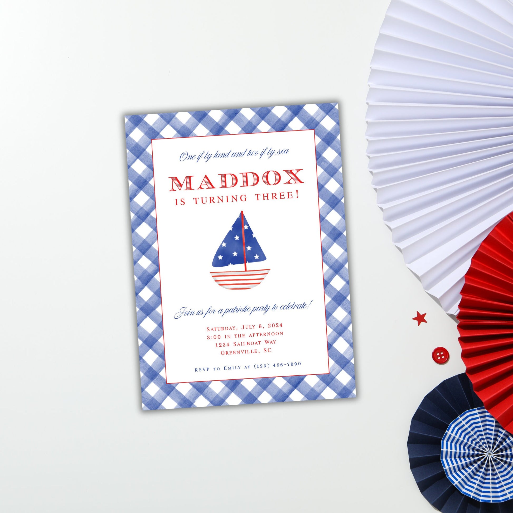 One if by land, two if by sea, your little patriot is turning three! Celebrate in style with this adorable July 4th birthday invitation from Emilemon Paper Studio! Featuring a watercolor sailboat, this patriotic birthday invite is perfect for a third birthday!