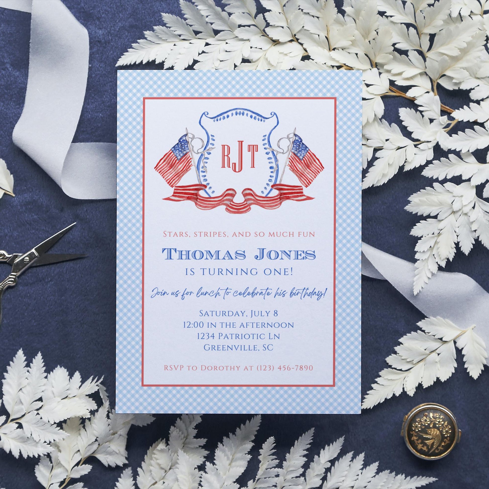 Celebrate your little firecracker in style with this precious patriotic July 4th first birthday party invitations from Emilemon Paper Studio! Complete with a gorgeous watercolor monogram crest, this invitation is perfect to celebrate your baby's first birthday!
