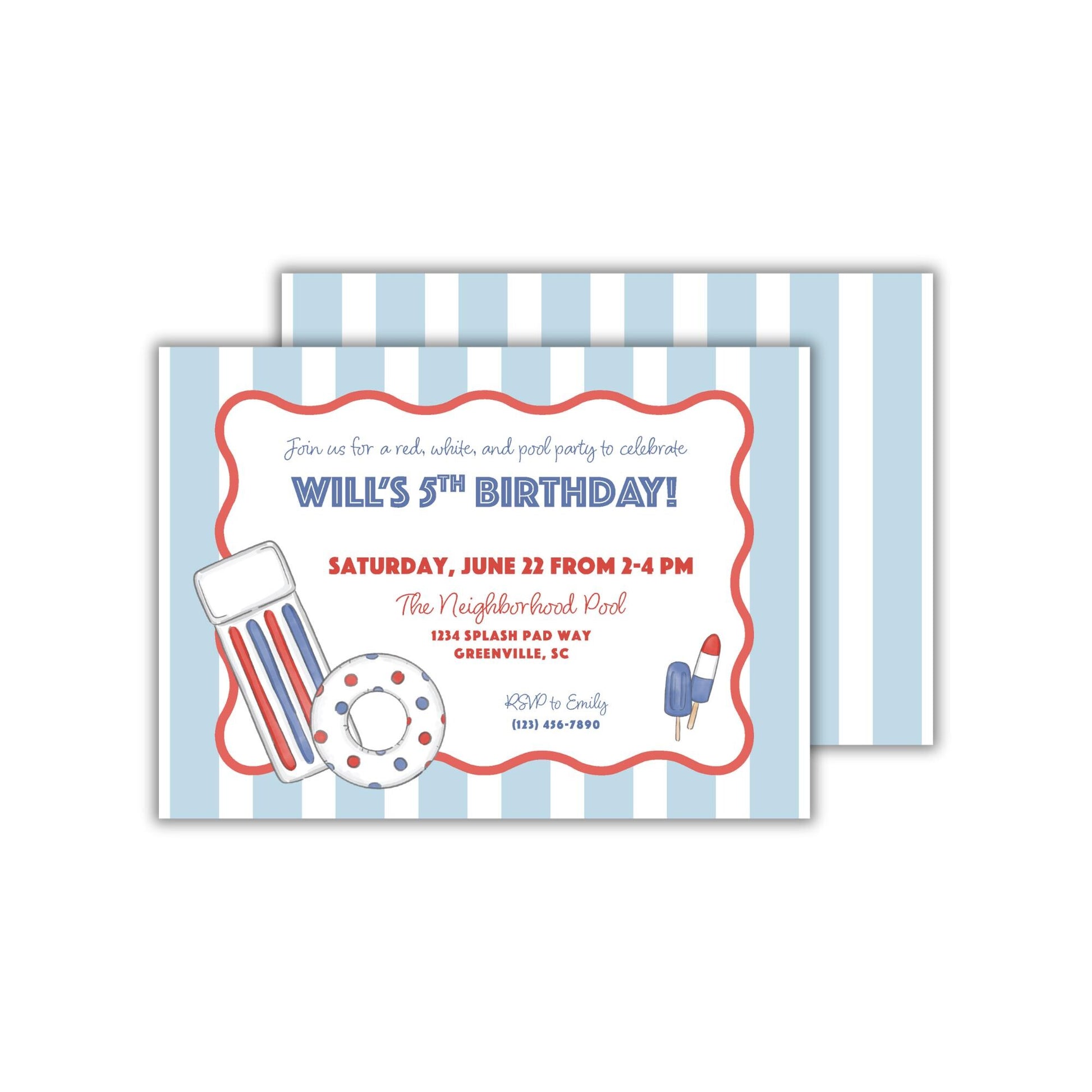 Celebrate in style with this July 4th pool party invitation from Emilemon Paper Studio! Featuring watercolor pool rafts and a wavy border, this patriotic invitation is perfect for a July birthday party!