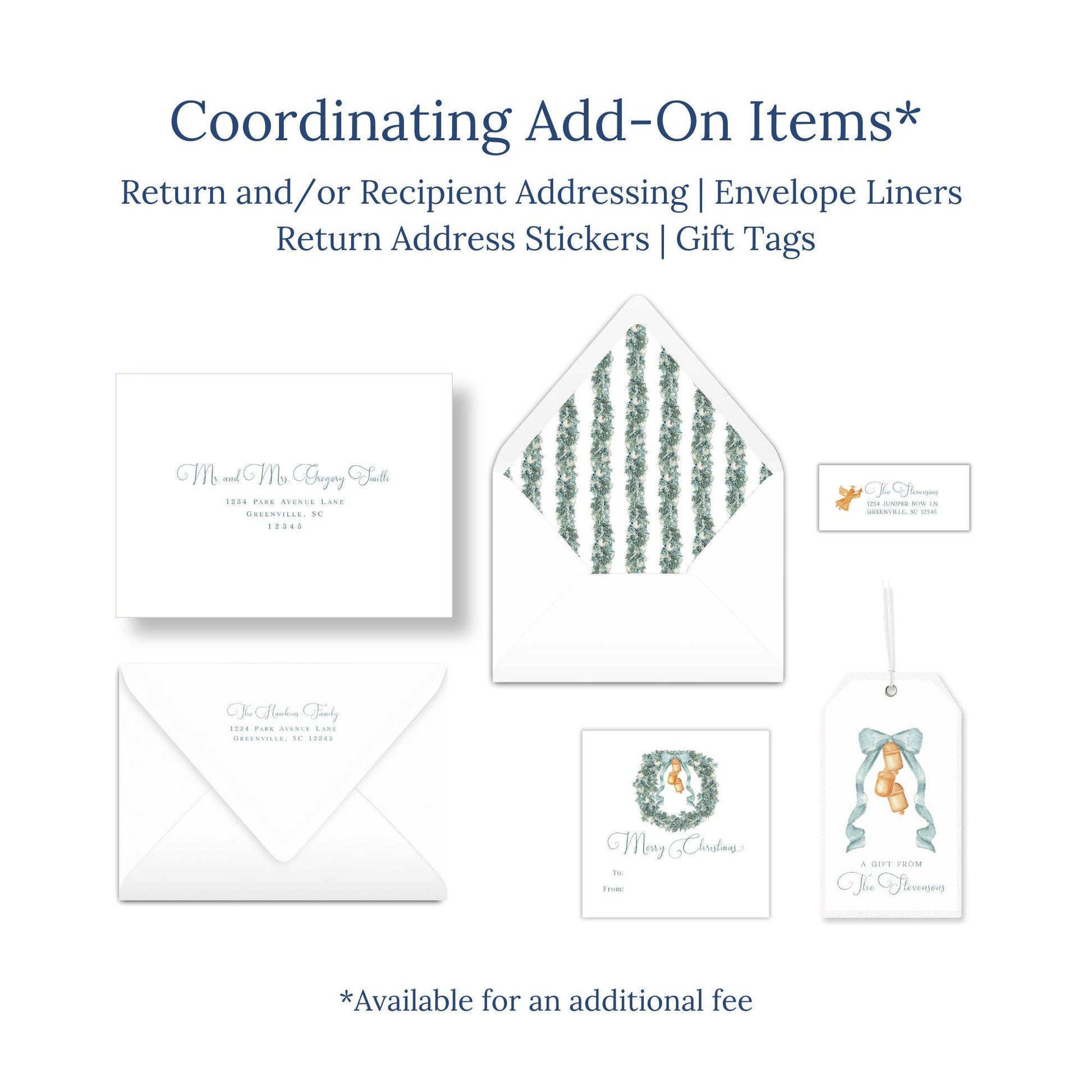 This holiday card is sized 7x5, and printed on thick 120 lb eggshell cover cardstock. Cards come with matching white square-flap envelopes. If you would like any extras such as envelope liners or return/recipient addressing, please contact me to purchase the additional listing for those upgrades.