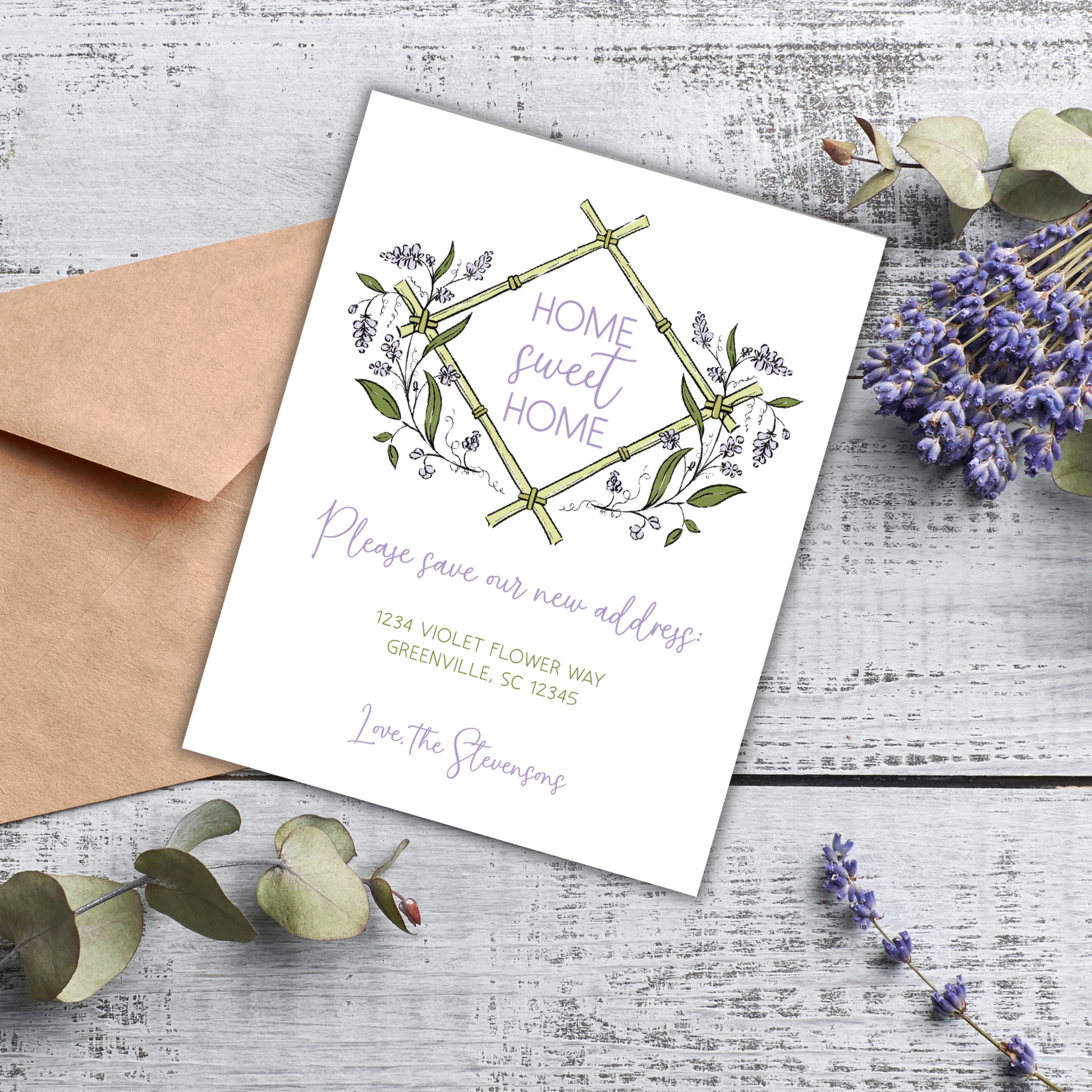 Make sure everyone knows your new address with these stunning lavender floral moving announcement cards from Emilemon Paper Studio! Featuring exclusive, hand-drawn artwork by Sarah O'Mary Designs, these floral bobbin change of address cards are perfect for a spring move!