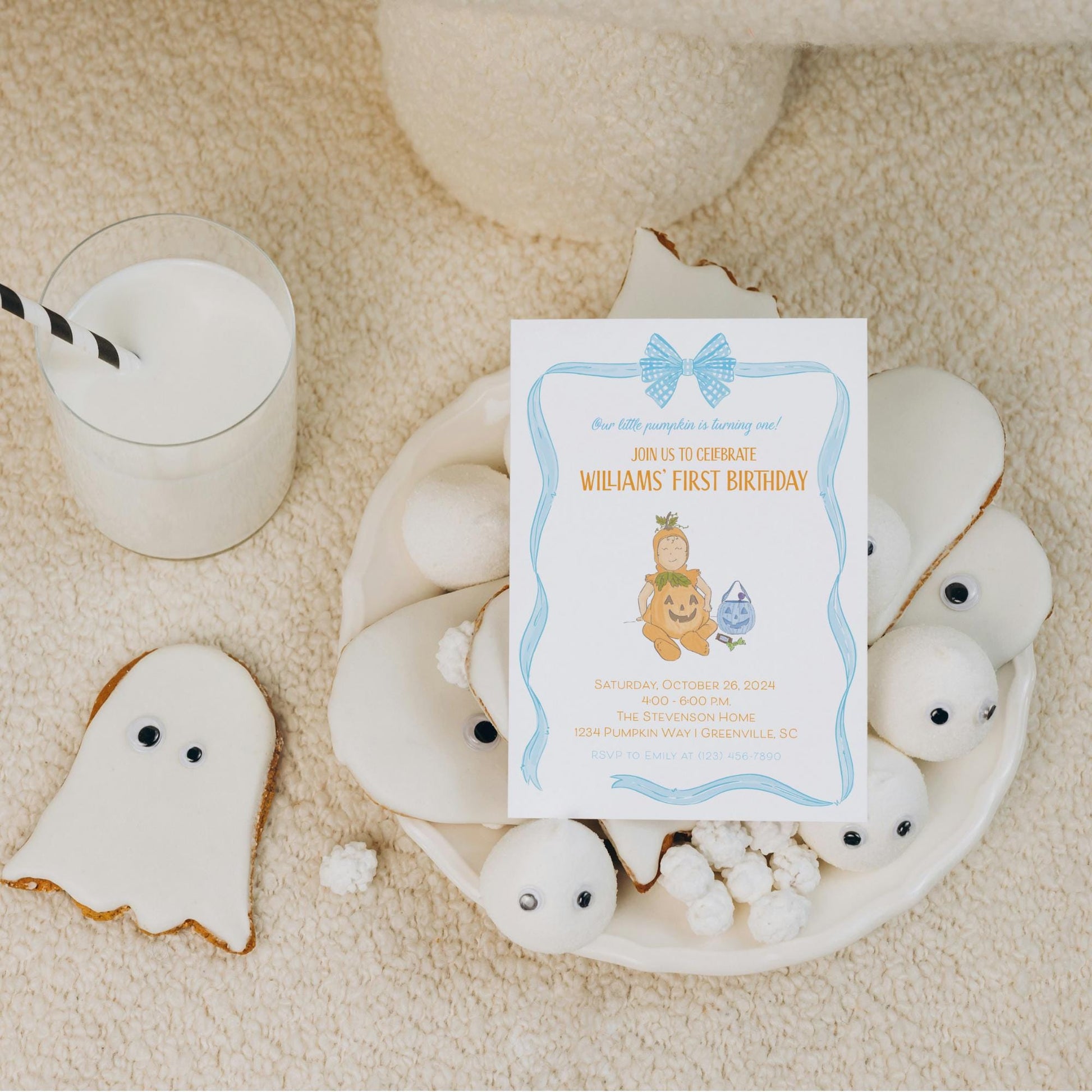 Celebrate your little pumpkin in style with this printed invitation from Emilemon Paper Studio! Featuring exclusive, hand-drawn artwork, this pumpkin invitation is perfect for a boy first birthday party!