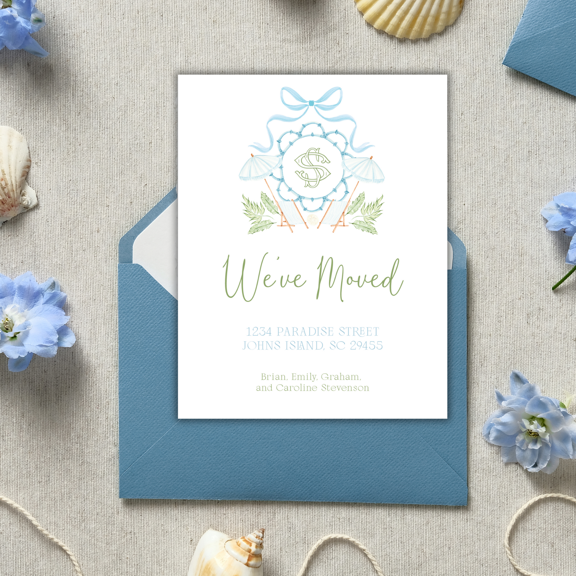 Make sure everyone knows your new address with these lovely monogrammed coastal moving announcement cards from Emilemon Paper Studio! Featuring exclusive, hand-painted watercolor artwork and a classic single-initial monogram, these watercolor "We Moved" cards are the perfect way to let everyone know your new beach address!