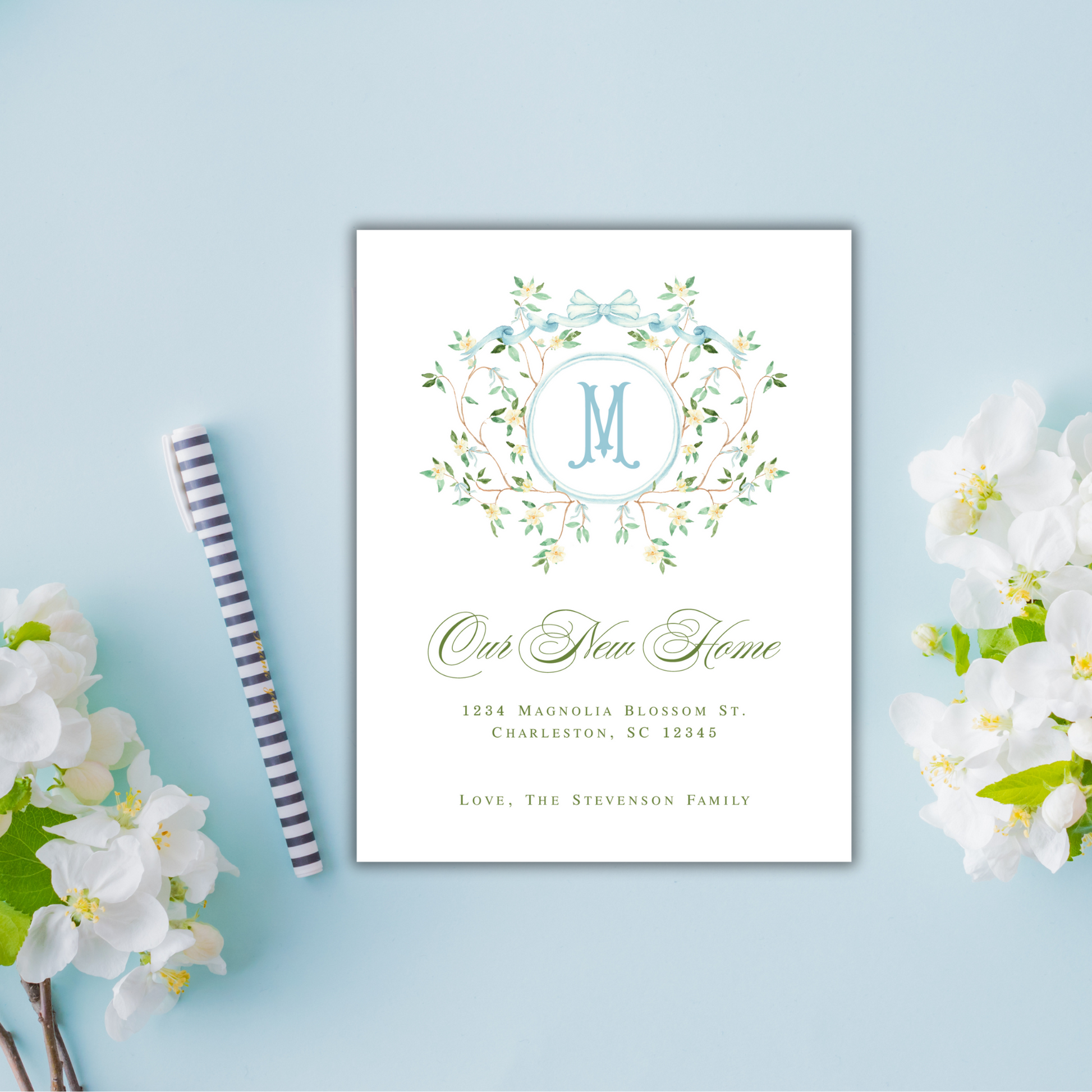 Make sure everyone knows your new address with these stunning monogrammed magnolia new address announcements! Featuring exclusive, hand-painted watercolor artwork and a classic single-initial monogram, these magnolia moving announcements are the perfect way to let everyone know about your new home sweet home!