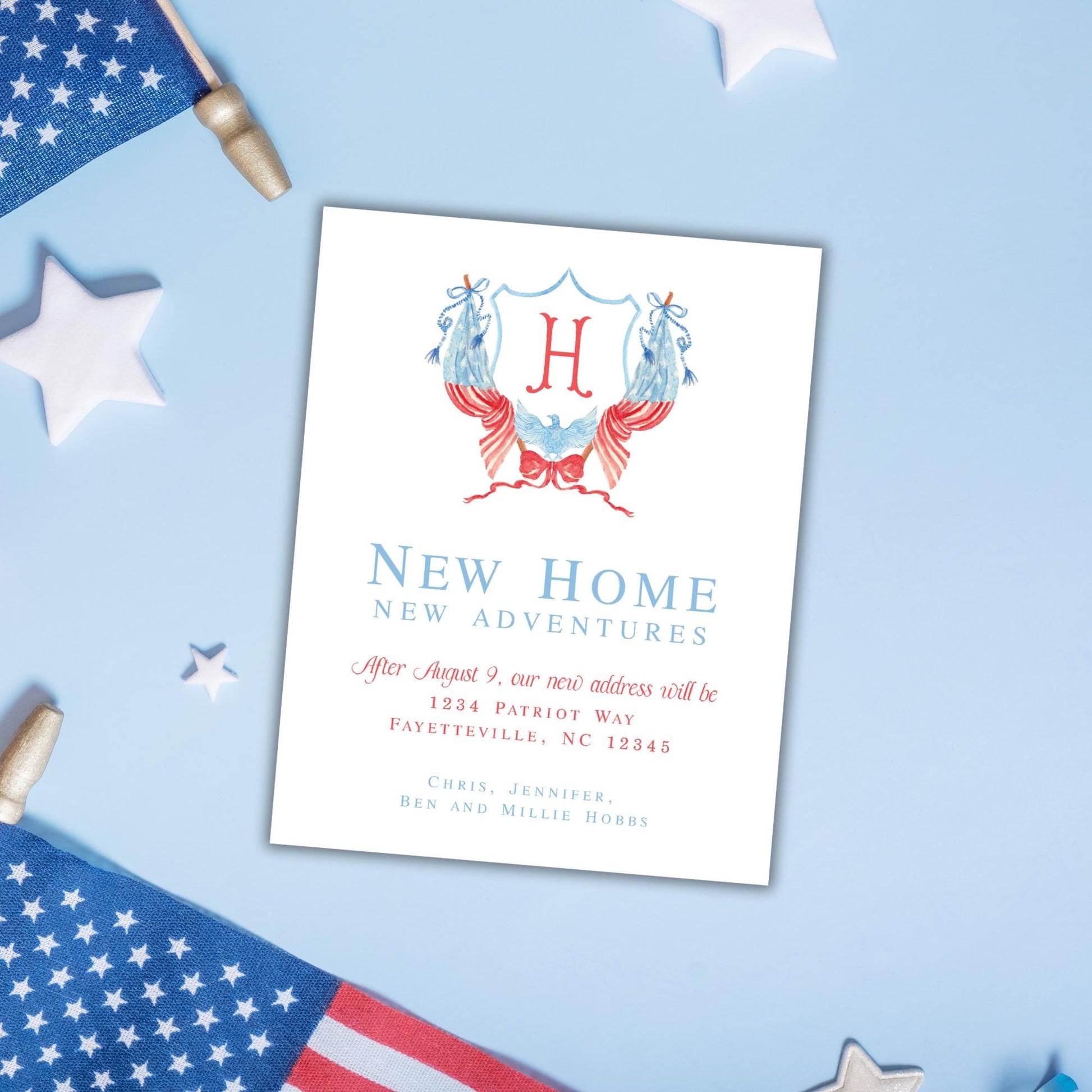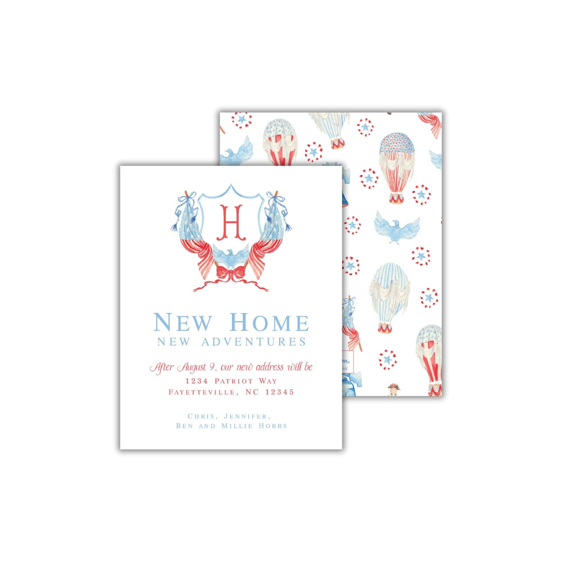 Make sure everyone knows about your new home with these stunning monogrammed patriotic moving announcement cards from Emilemon Paper Studio! Featuring exclusive, hand-painted watercolor artwork, these printed monogram moving announcements are perfect for the Air Force, Army, Navy, and other military members facing a PCS move!