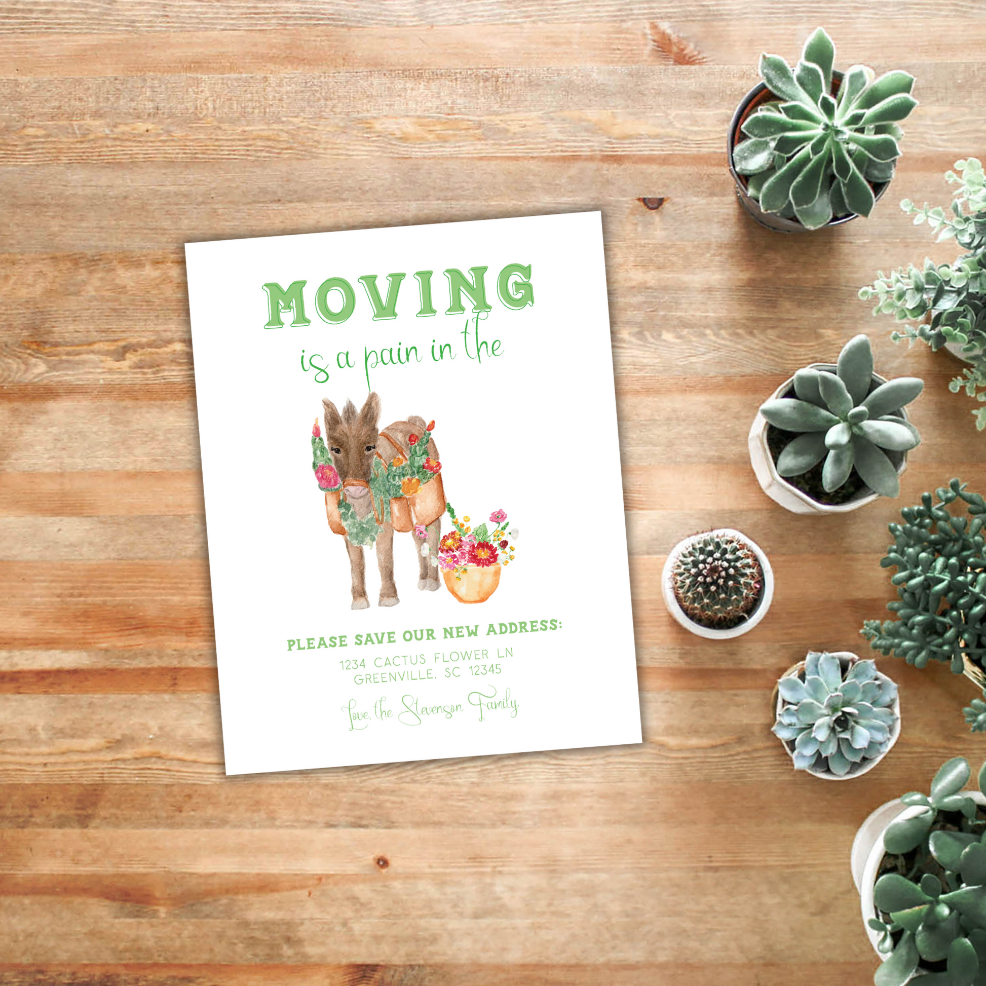 Moving is a pain in the...well, you know. Make sure everyone has your new address with these donkey moving announcement cards from Emilemon Paper Studio! Featuring exclusive, hand-painted watercolor artwork, these address change cards are the perfect housewarming gift or realtor gift...maybe with a bottle of something fun.