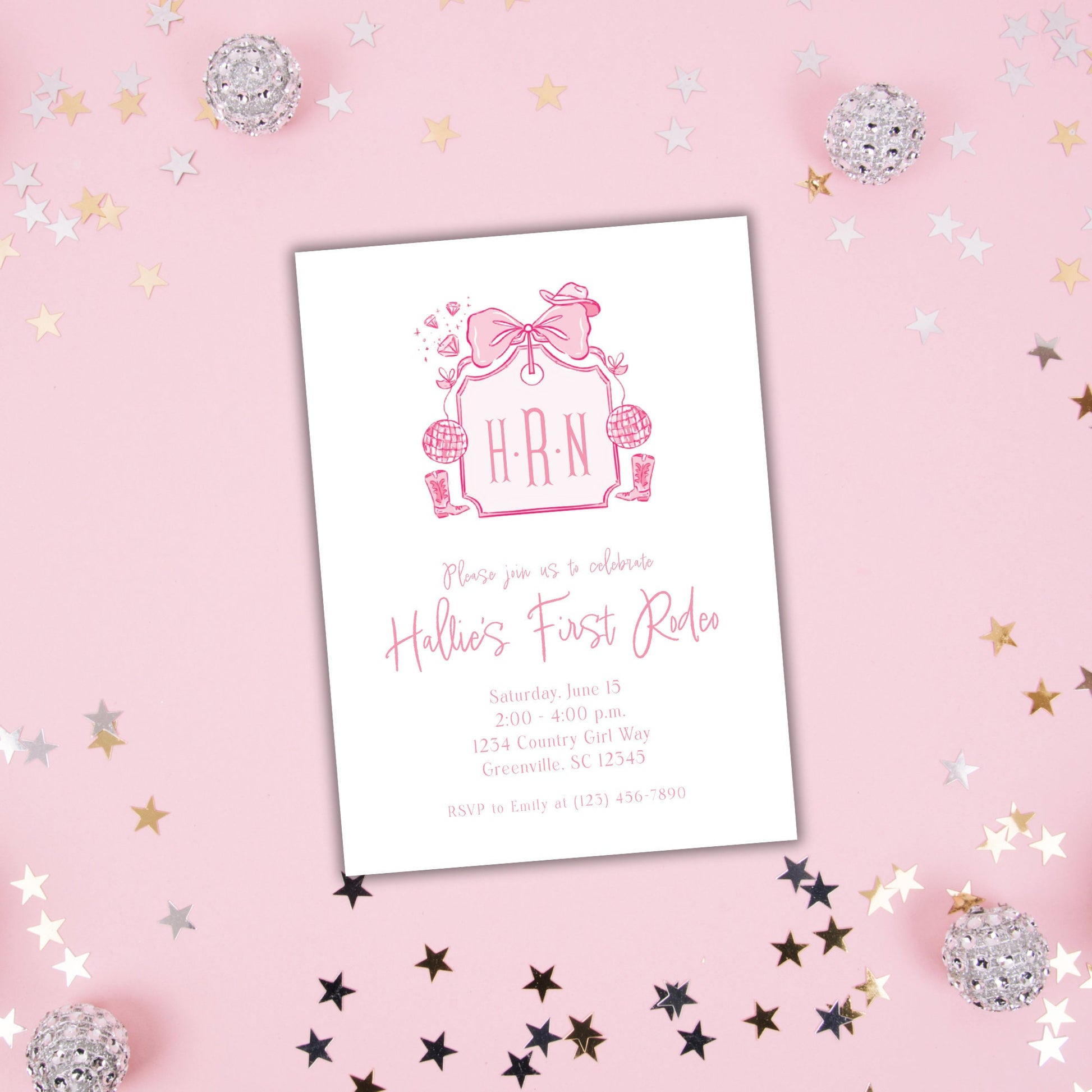 Giddy up, girls! Celebrate your little cowgirl in style with this monogrammed "My First Rodeo" first birthday party invitation from Emilemon Paper Studio! Featuring hand-drawn watercolor artwork and a classic three-initial monogram, these first rodeo invites are the perfect way to celebrate!