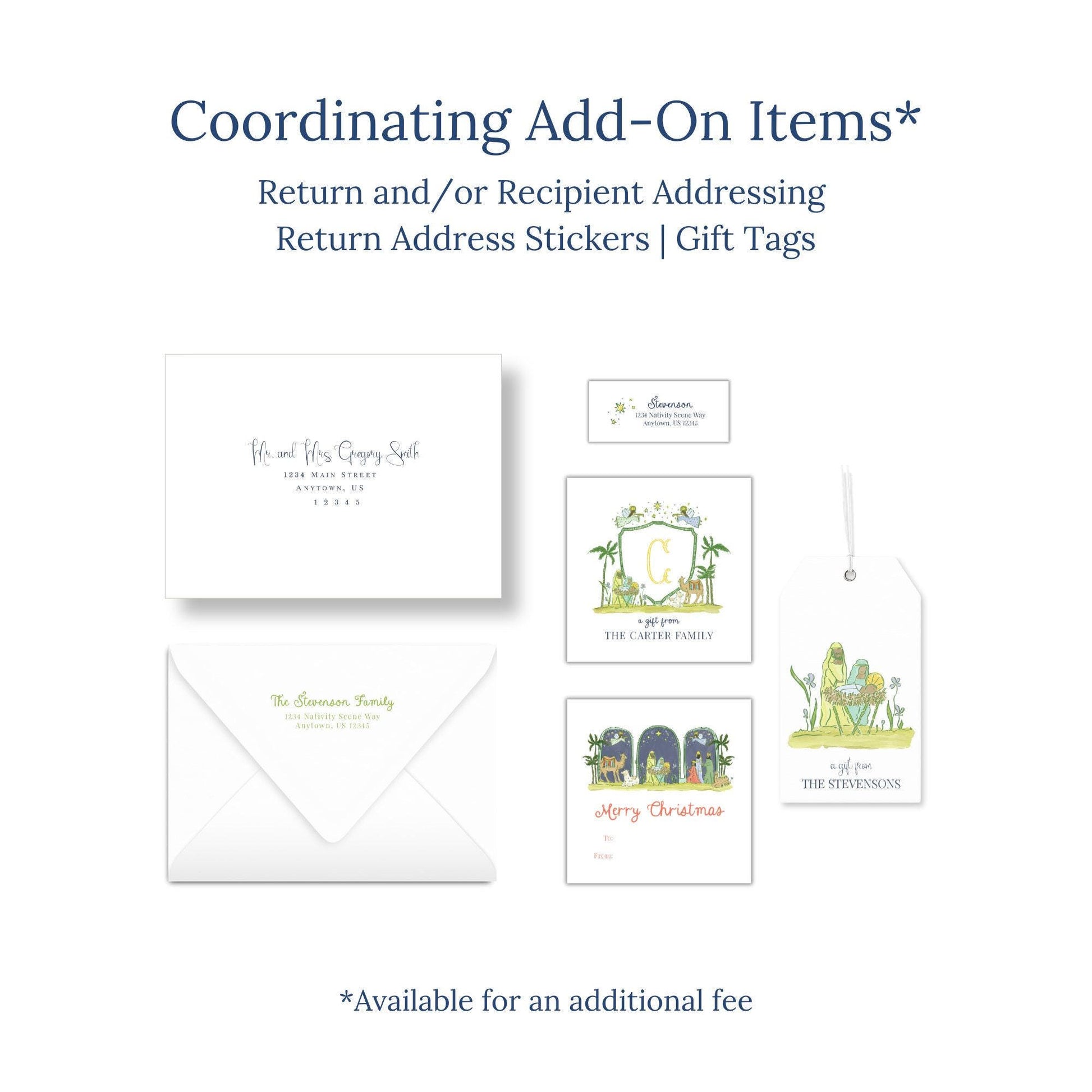 This holiday card is sized 5x7, and printed on thick 120 lb eggshell cover cardstock. Cards come with matching white square-flap envelopes. If you would like any extras such as envelope liners or return/recipient addressing, please contact me to purchase the additional listing for those upgrades.