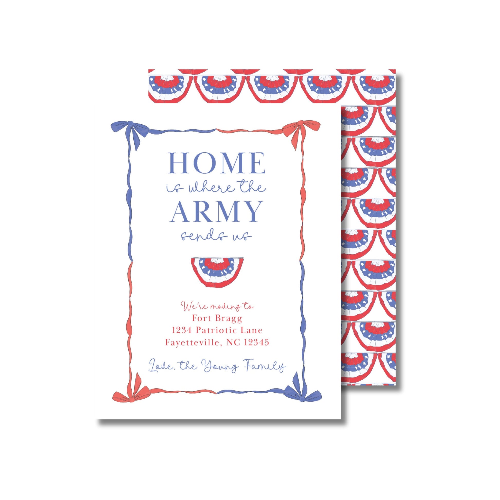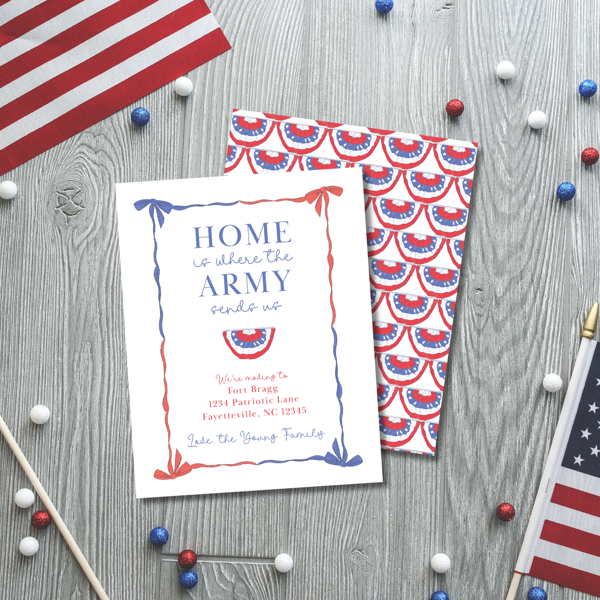 Make sure everyone knows about your new home with these patriotic bunting moving announcement cards from Emilemon Paper Studio! Featuring exclusive, hand-painted watercolor artwork, these printed monogram moving announcements are perfect for the Air Force, Army, Navy, and other military members facing a PCS move!