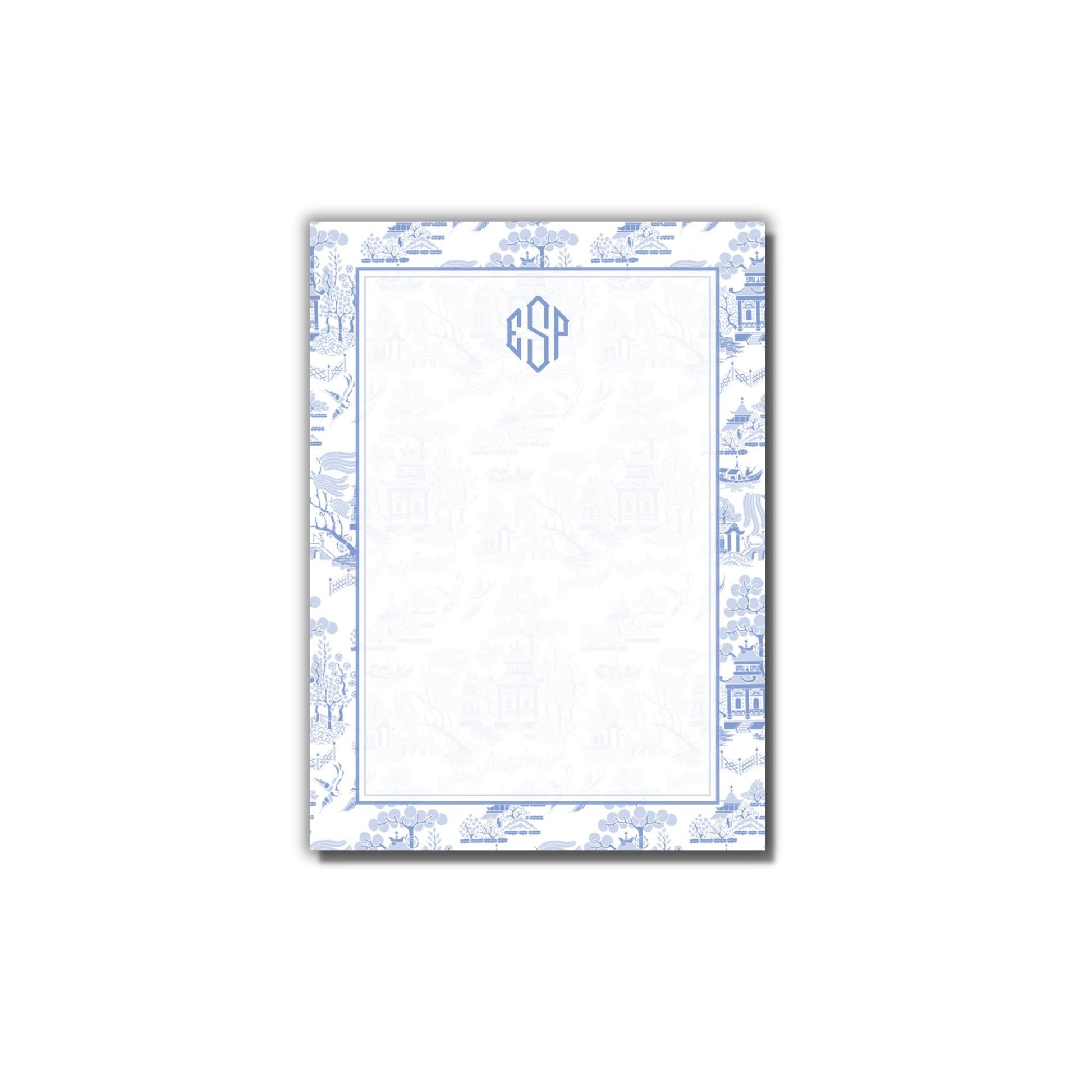 Take notes in style with this monogrammed blue chinoiserie toile notepad from Emilemon Paper Studio!