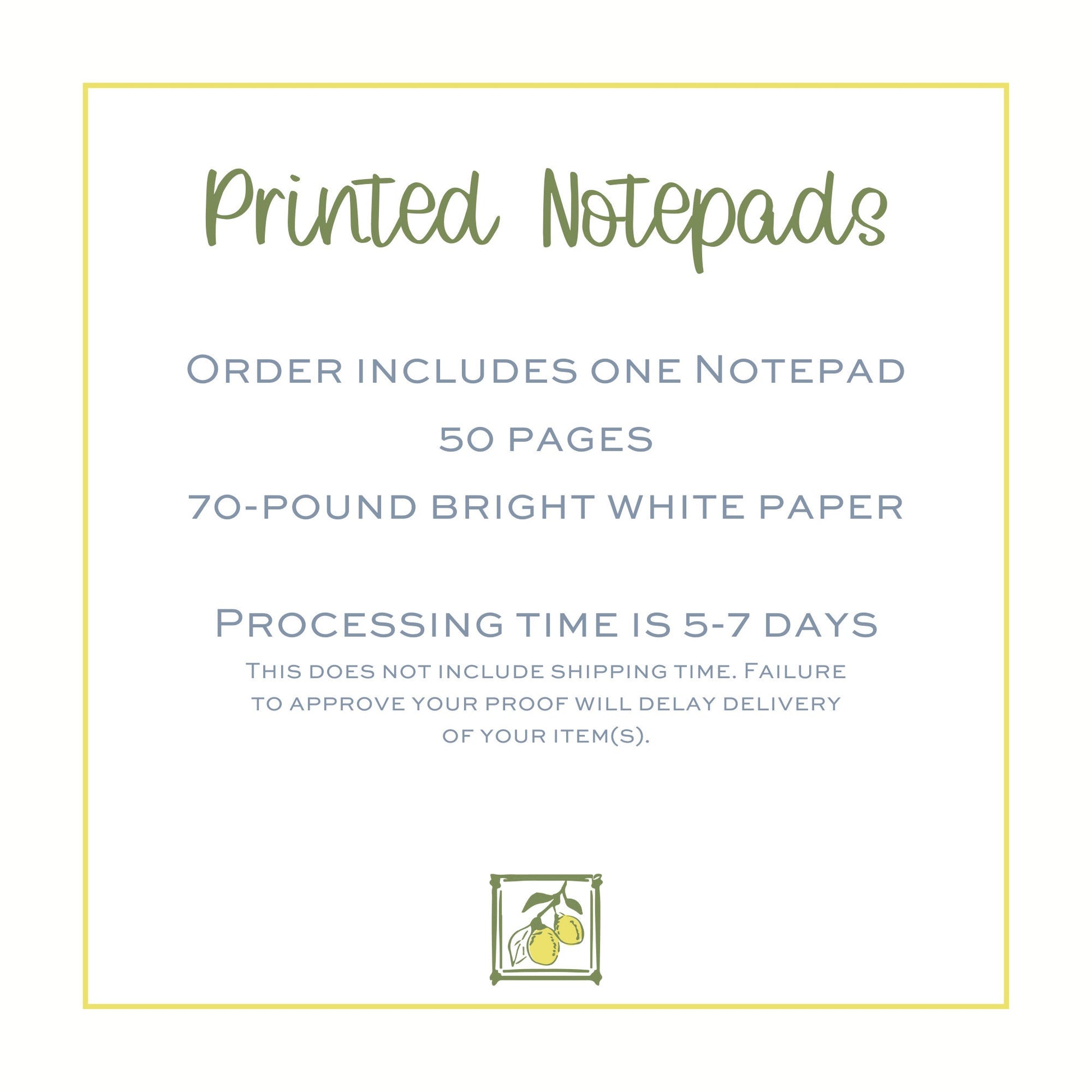 Notepads come with 50 pages, and are sized 5x7 inches for plenty of room for note-taking. Paper is 70lb smooth white paper. The personalized design is on each page. Once I receive all personalization info, I will email you a proof within 24 hours. After the proof has been approved, your notepad will be sent into production and then shipped directly to you.