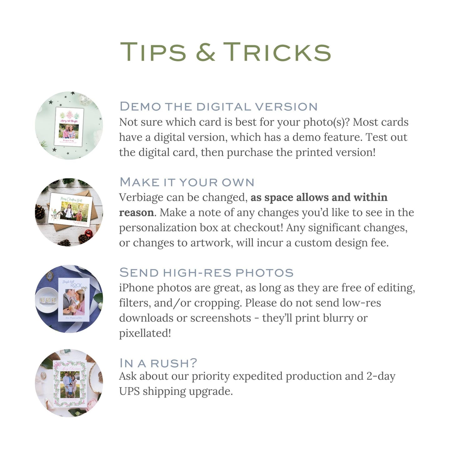 This Christmas card is sized 7x5, and printed on thick 120 lb eggshell cover cardstock. Cards come with matching white square-flap envelopes. If you would like any extras such as envelope liners or return/recipient addressing, please contact me to purchase the additional listing for those upgrades.