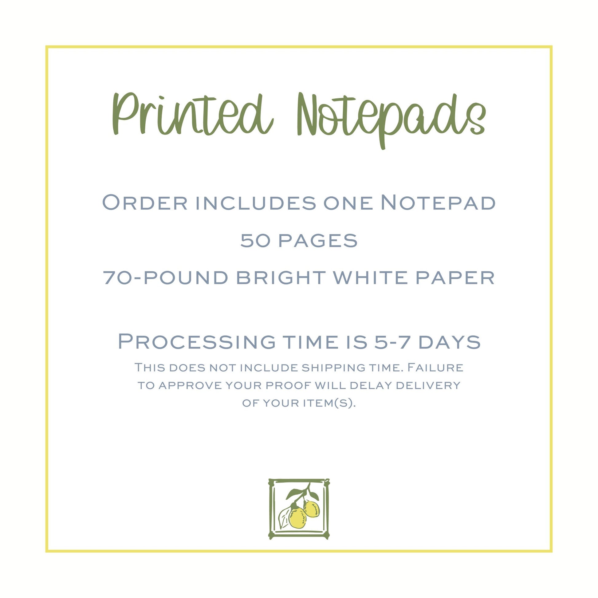 Once I receive all personalization info, I will email you a proof within 24 hours. After the proof has been approved, your notepad will be sent into production and then shipped directly to you.