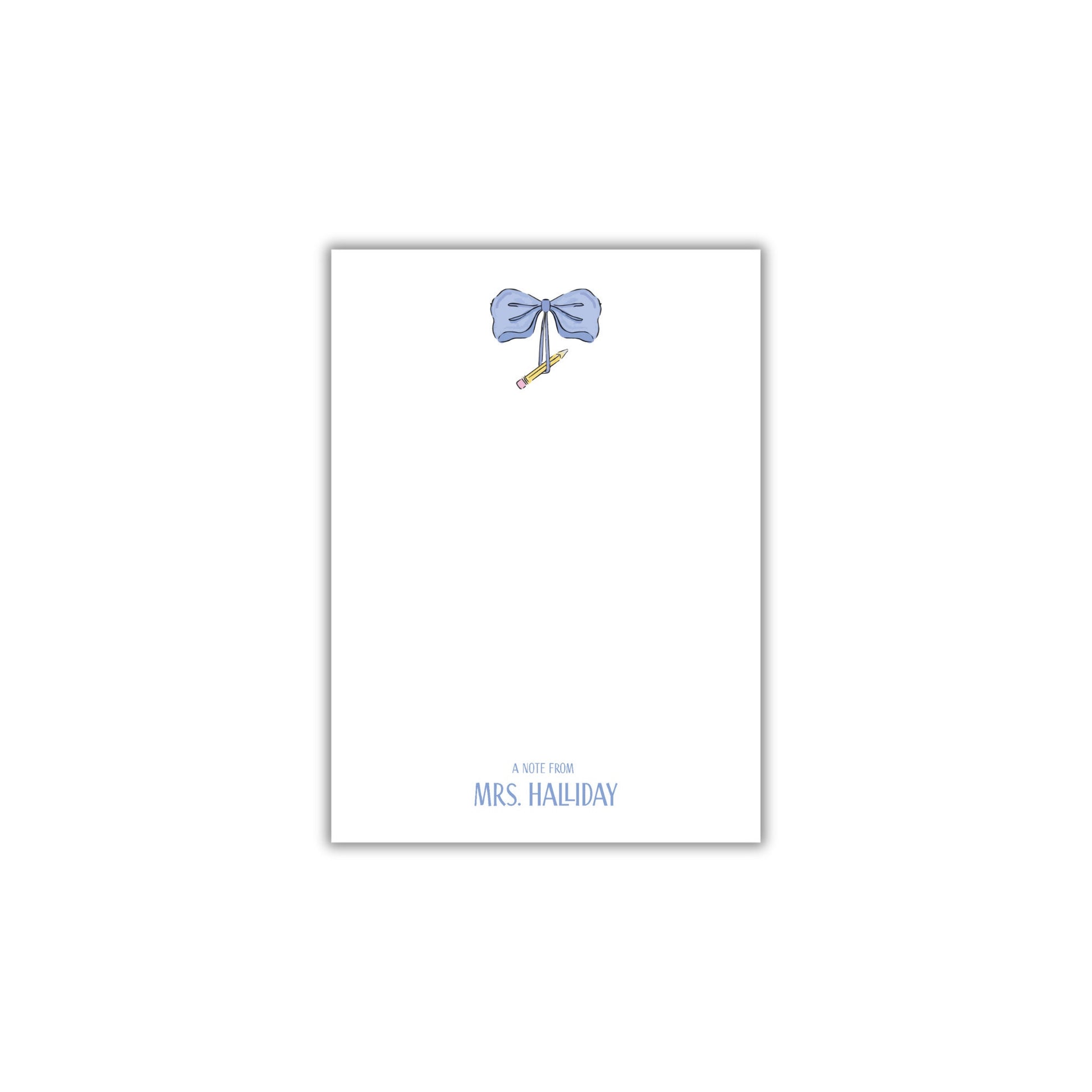 Give your teacher what she really wants with this adorable blue bow and pencil notepad for teachers from Emilemon Paper Studio! Featuring exclusive, hand-drawn artwork from Sarah O'Mary Designs, this personalized notepad is a perfect teacher appreciation gift!