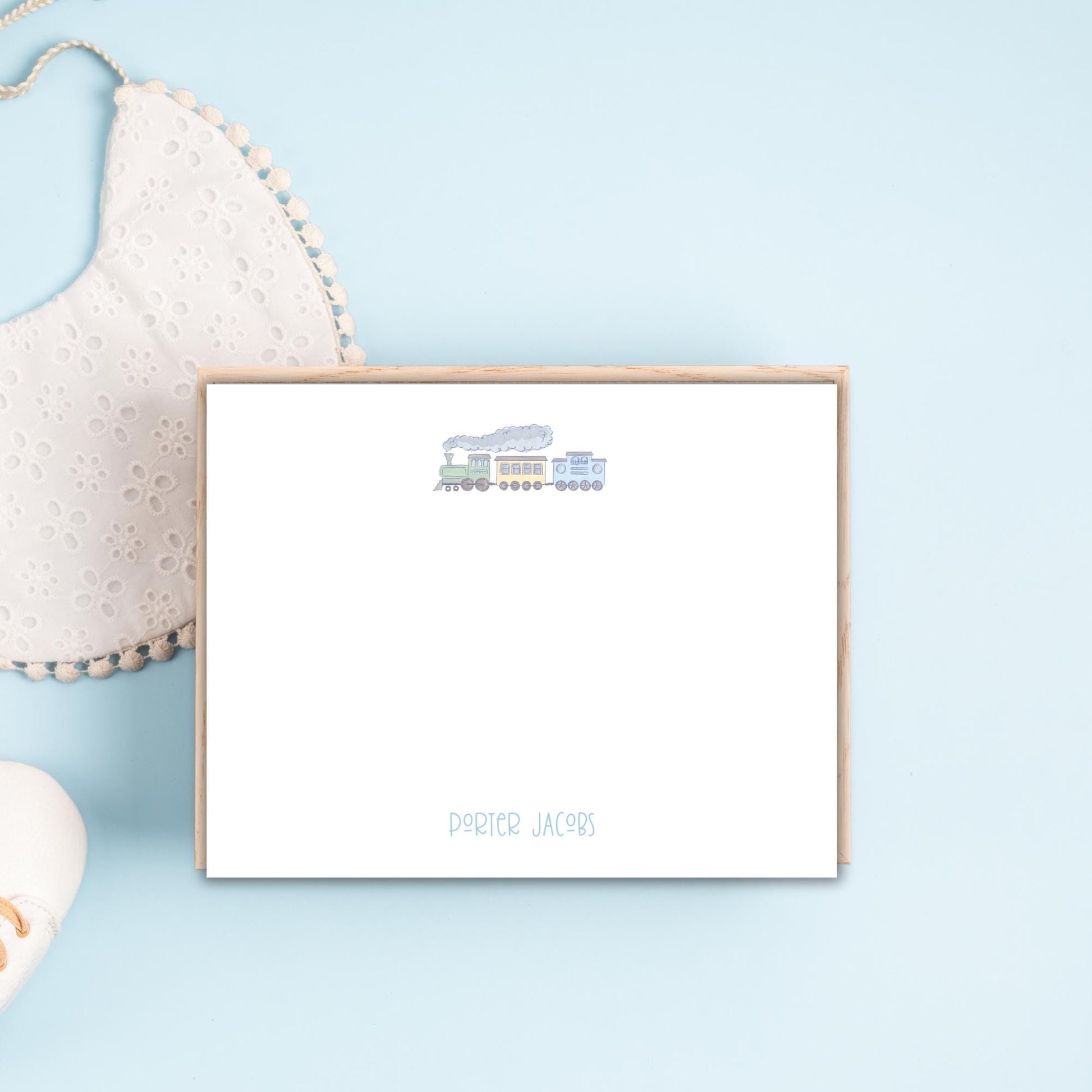 Send thank-you notes in style with this personalized train little boy stationery from Emilemon Paper Studio! Featuring exclusive, hand-drawn artwork from Sarah O'Mary Designs, these watercolor train notecards are the perfect boy thank you notes!