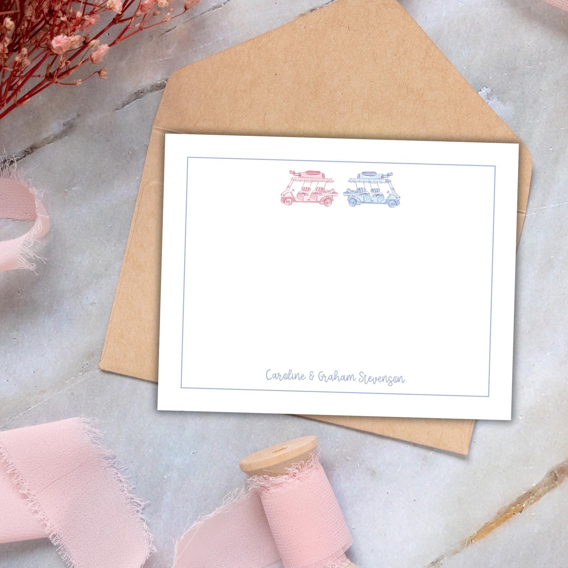Encourage gratitude starting young with this pink and blue golf notecard set for siblings! Featuring hand-drawn artwork, these personalized golf cart notecards for kids are the perfect golf stationery!