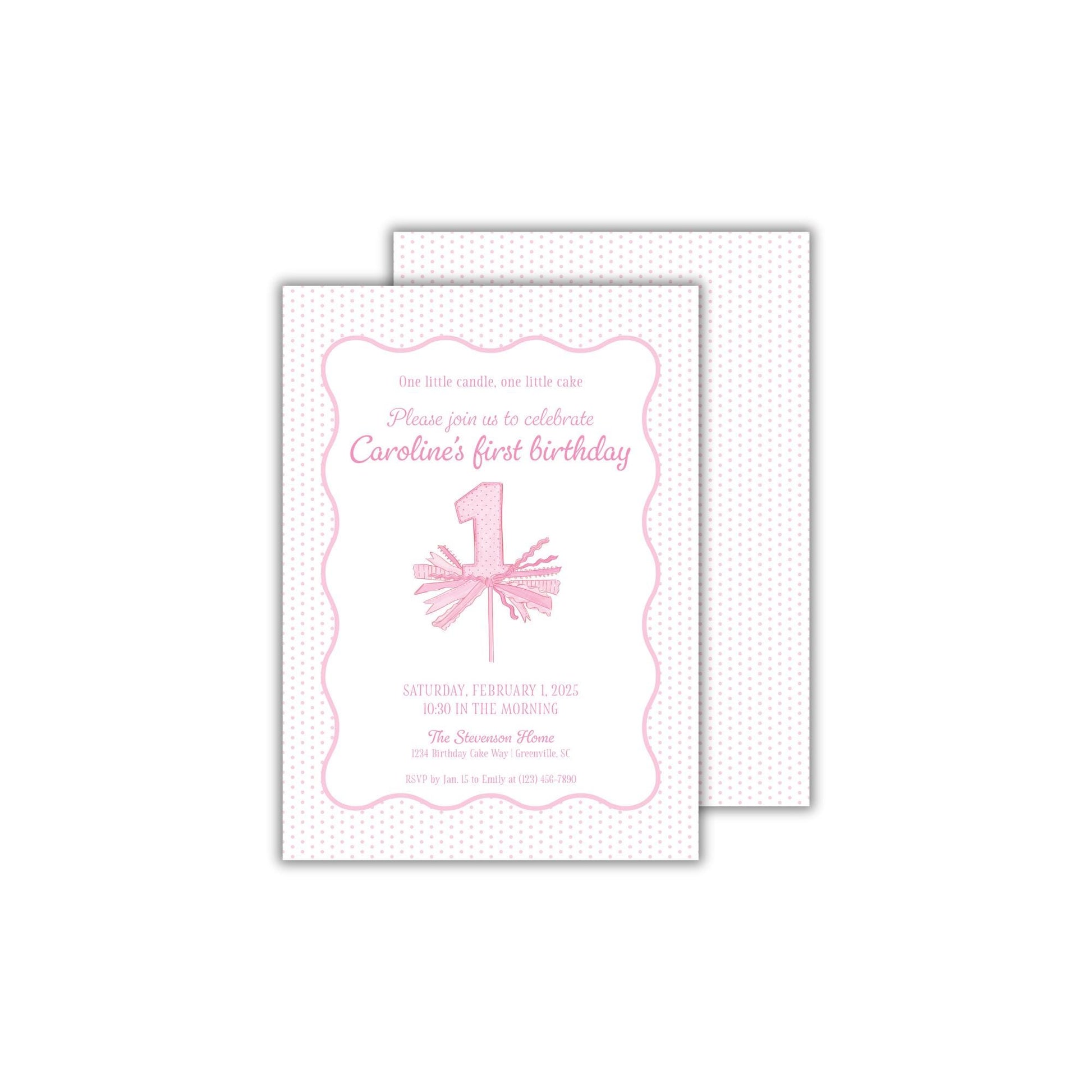 Celebrate your little one in style with this stunning classic pink cake topper first birthday invitation from Emilemon Paper Studio! Featuring exclusive, hand-drawn artwork in a simple pink and white color scheme, this first birthday party invite is perfect for one little candle, one little cake!