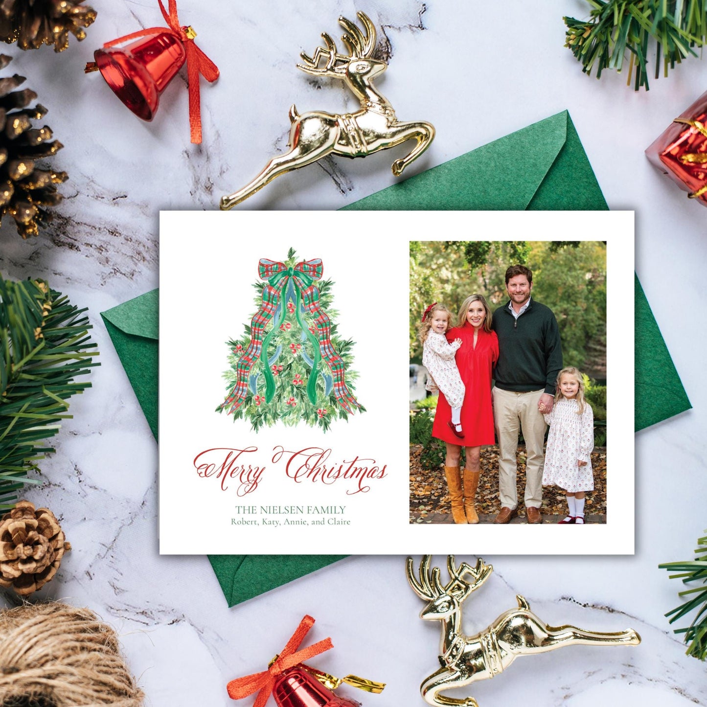 Send holiday greetings in style with these elegant plaid bow Christmas tree photo cards from Emilemon Paper Studio! Featuring exclusive, hand-painted artwork from Lydia's Designer Collective, these classic family holiday cards are perfect for anyone who loves a traditional Christmas!