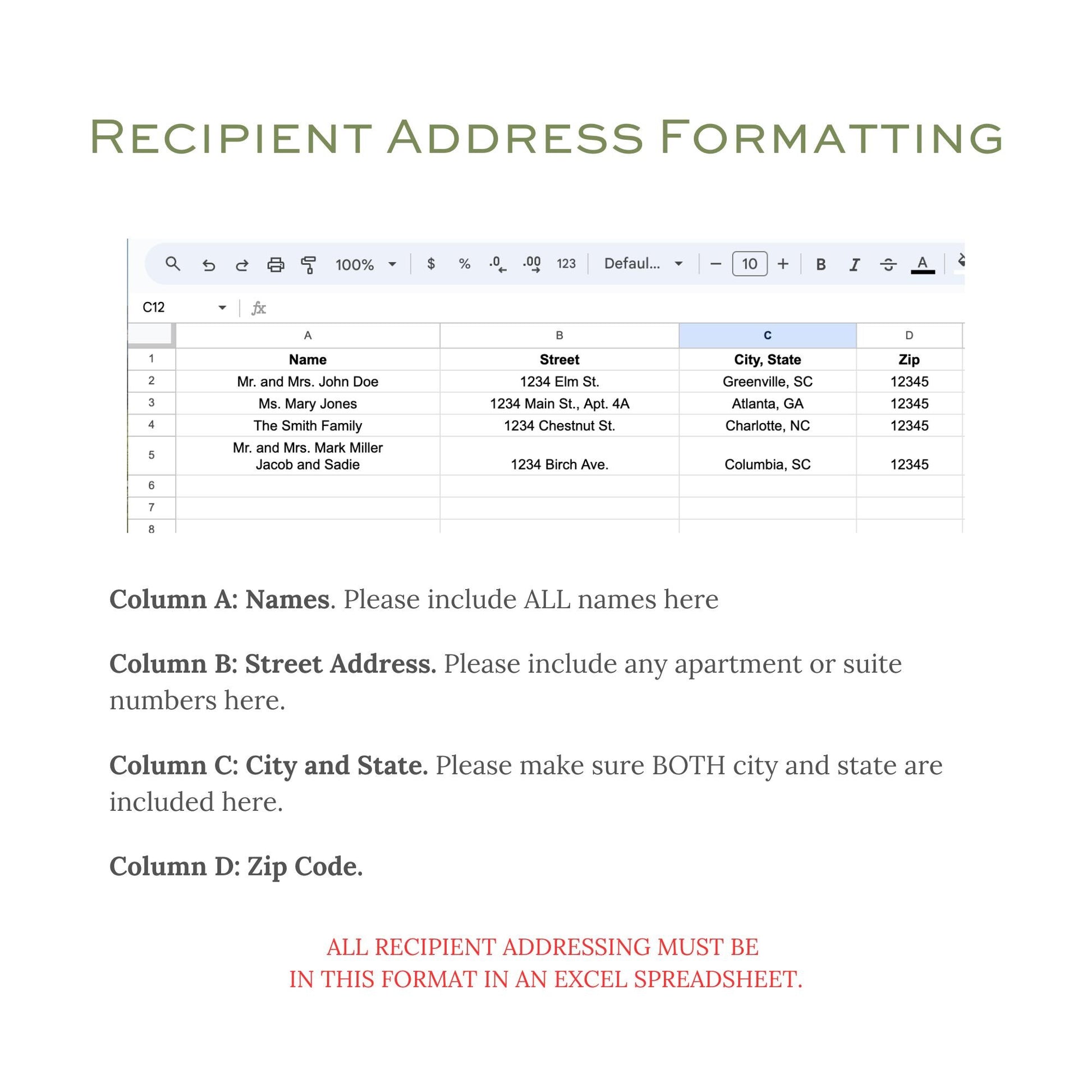 NOTE: The information you provide is copied and pasted into a program that populates your recipient envelope addressing. Emilemon Paper Studio is not responsible for any typos or errors in the customer's original document. Please double-check all spellings, including names, addresses, street numbers, cities, and zip codes.