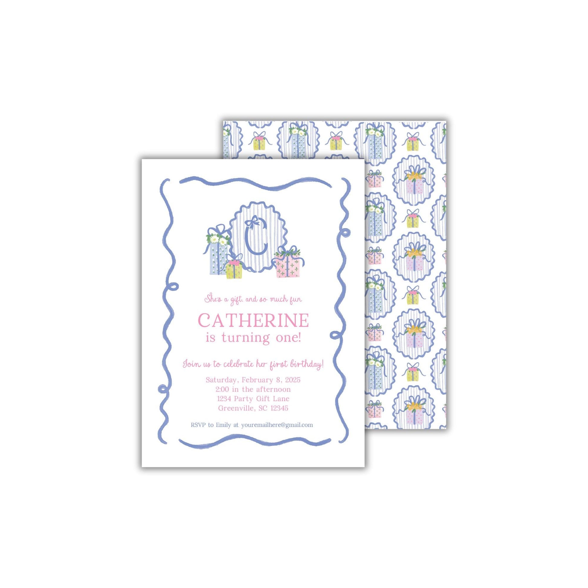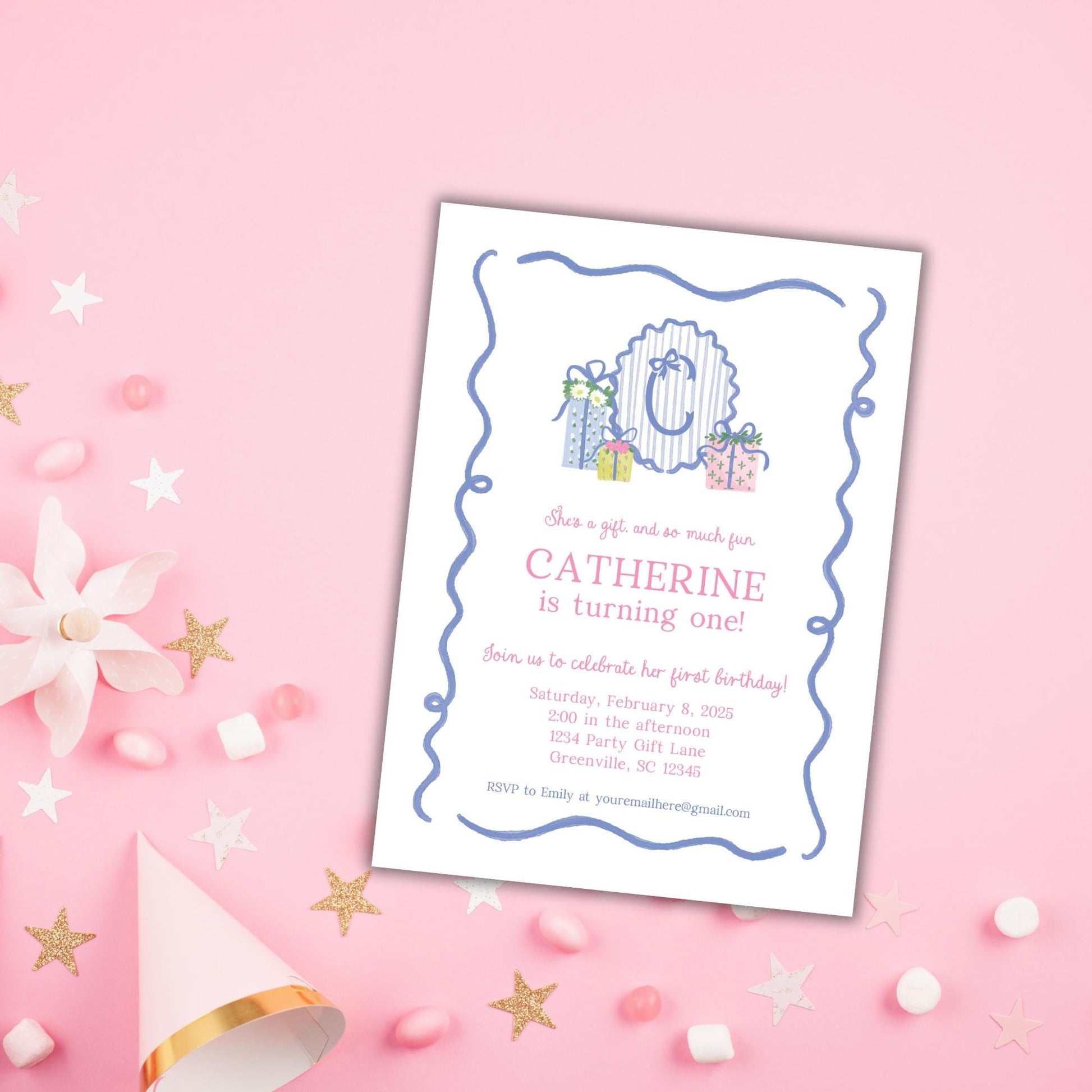She's a gift, and so much fun! Celebrate your little one with this stunning watercolor girl first birthday party invitation from Emilemon Paper Studio! Featuring exclusive, hand-drawn artwork from Sarah O'Mary Designs, this monogrammed gift birthday invitation is perfect for your little lady!