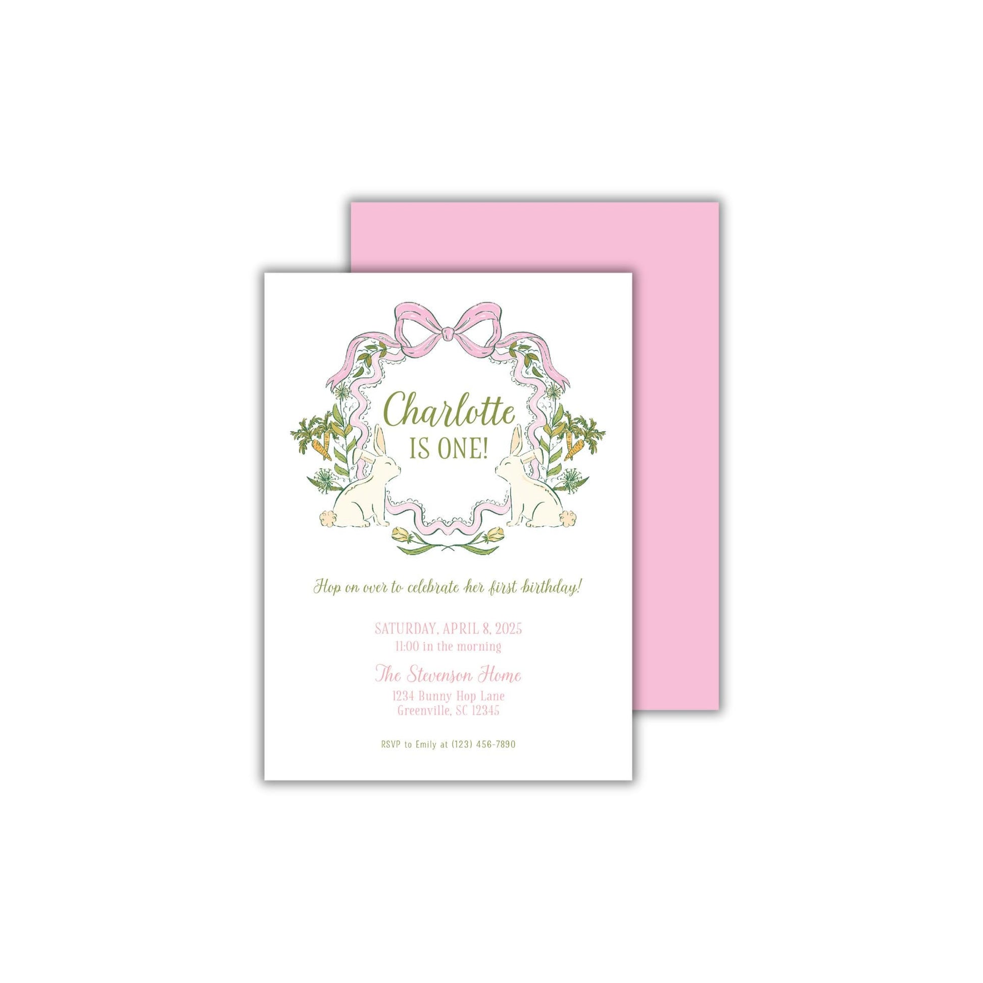 Somebunny is turning one! Celebrate your little one in style with this stunning watercolor Easter bunny birthday invitation! Featuring exclusive, hand-drawn artwork by Sarah O'Mary Designs, this first birthday invitation is perfect for a girl's birthday party!