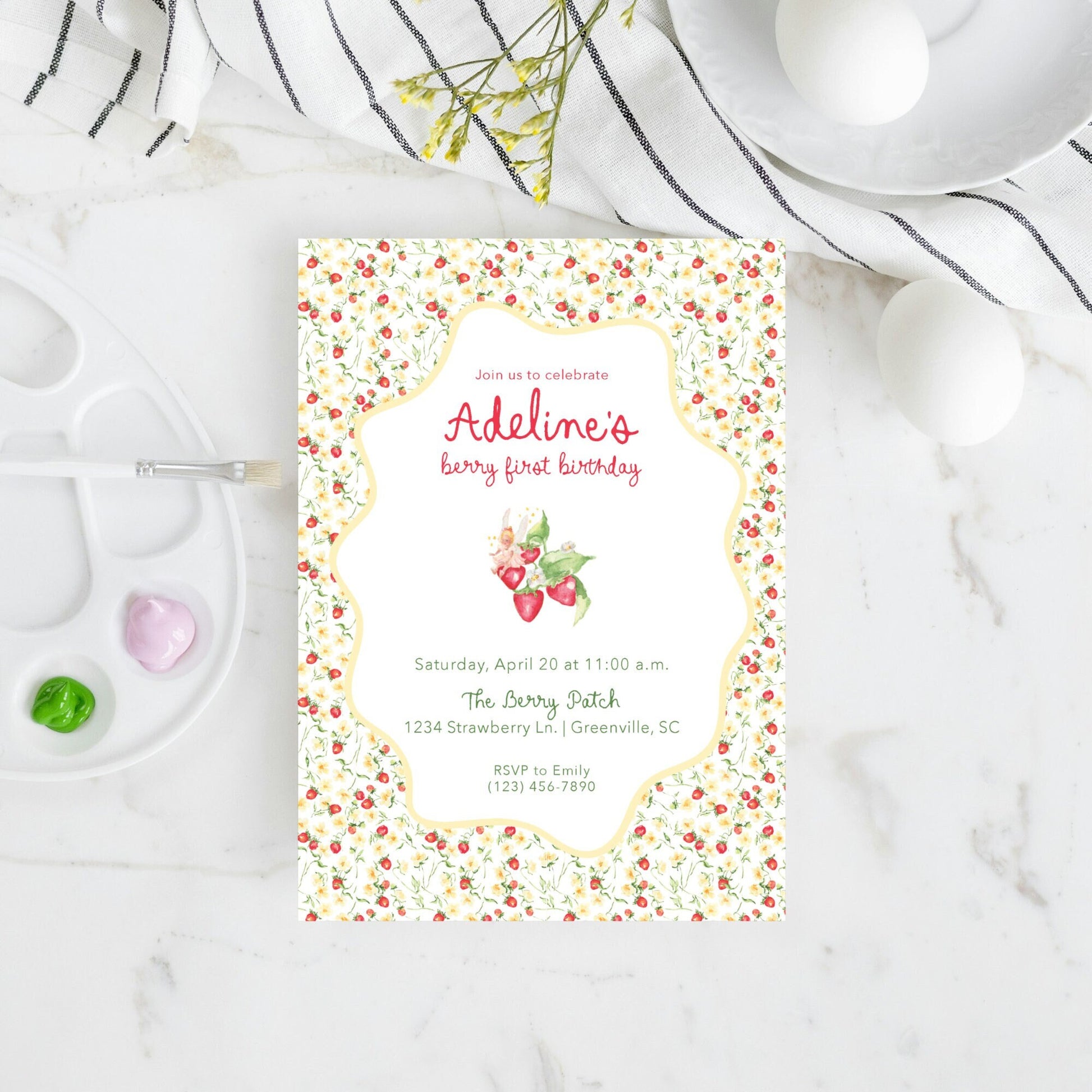 Celebrate your little one's "berry first" birthday in style with this strawberry party invitation from Emilemon Paper Studio! Featuring exclusive, hand-painted watercolor artwork, these printed invitations are perfect for a summer birthday party!