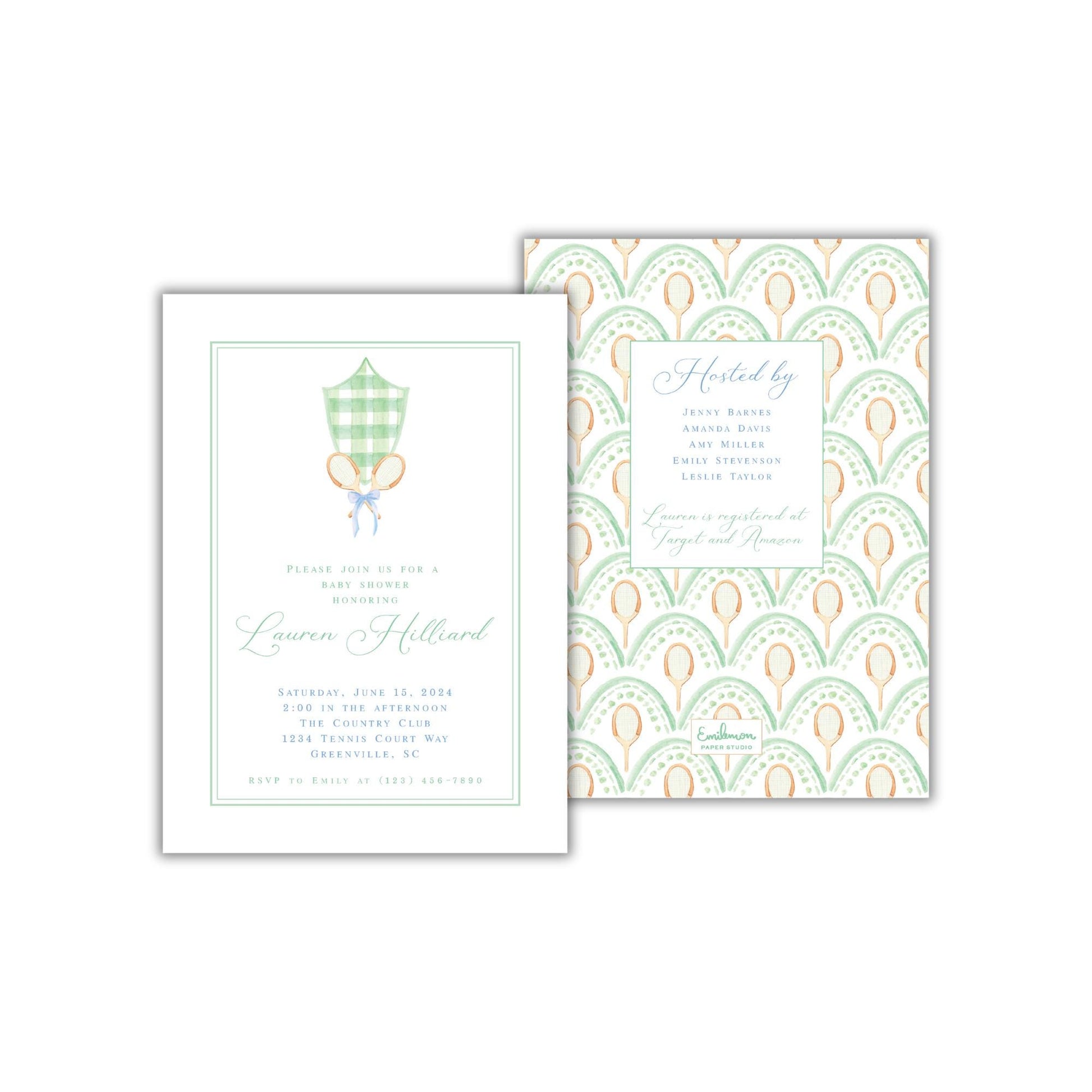 Do you have a new little love on the way? Celebrate in style with this adorable tennis baby shower invitation from Emilemon Paper Studio! Featuring exclusive, hand-painted watercolor artwork, this baby shower invite is perfect for a tennis shower!