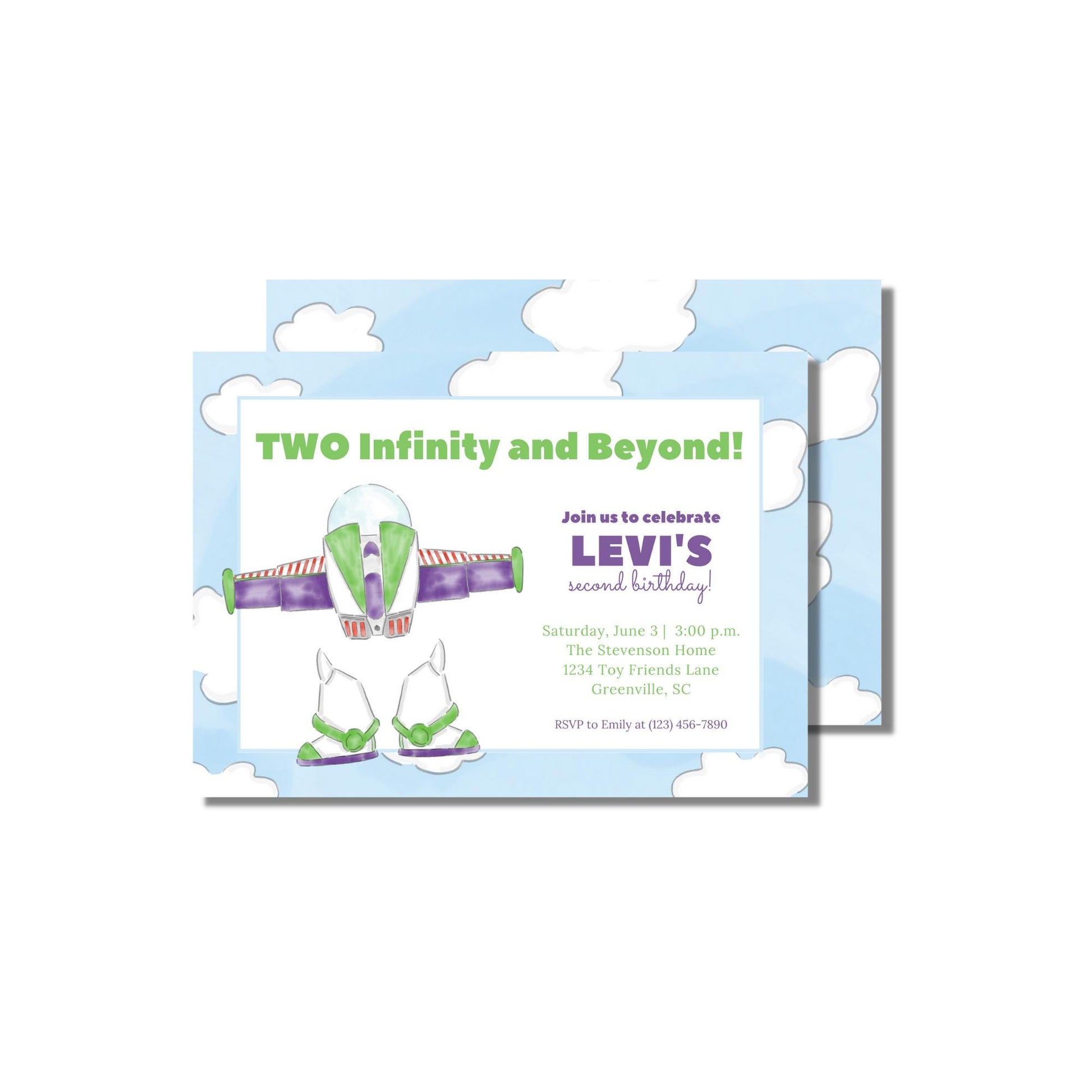 TWO infinity and beyond! Celebrate your little spaceman's second birthday with this toy friends birthday invitation from Emilemon Paper Studio!