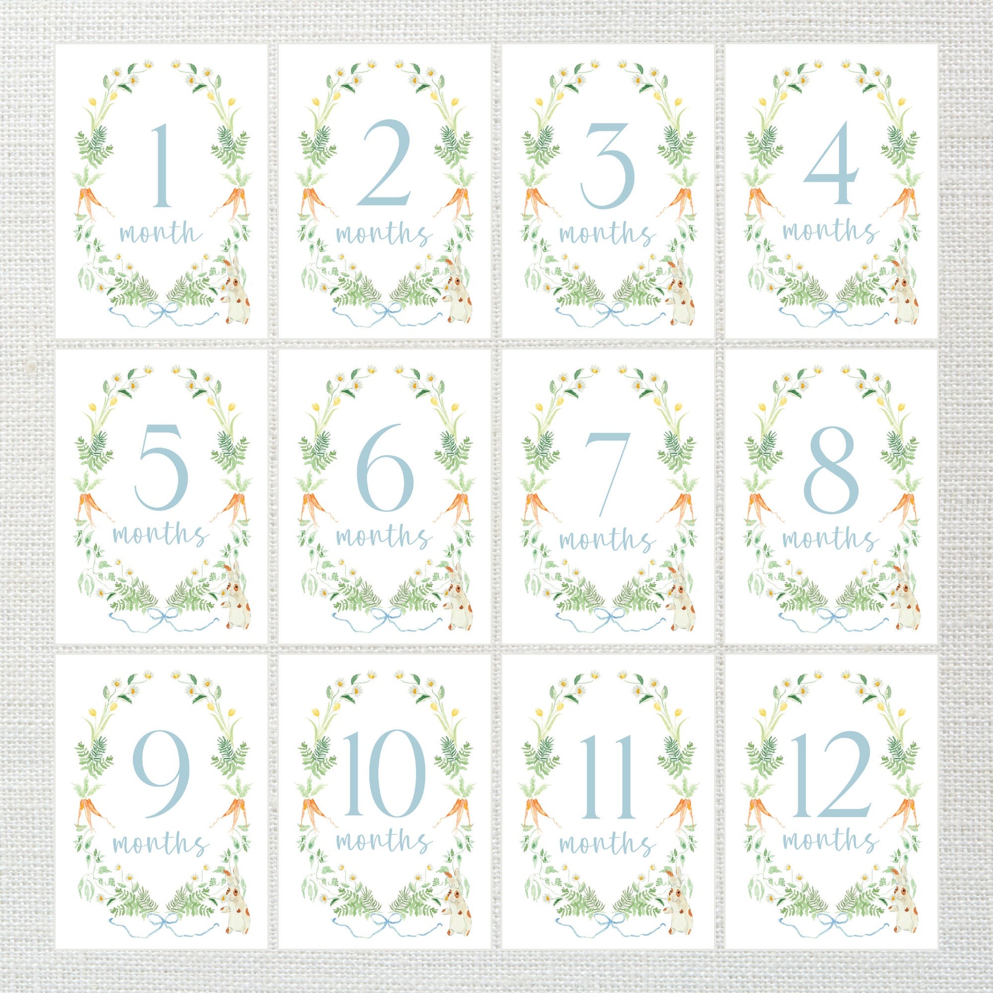 Chronicle your baby's growth with these precious watercolor bunny garden monthly milestone card set. Featuring exclusive, handpainted watercolor artwork, these first year cards are perfect for a baby boy or baby girl!