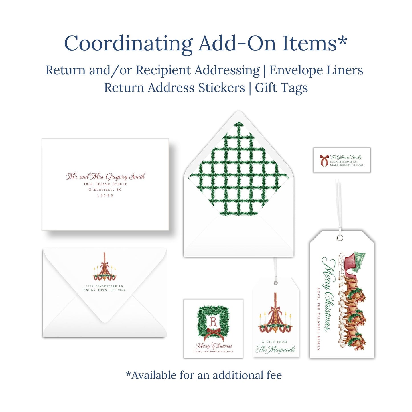 This Christmas card is sized 5x7, and printed on thick 120 lb eggshell cover cardstock. Cards come with matching white square-flap envelopes. If you would like any extras such as envelope liners or return/recipient addressing, please contact me to purchase the additional listing for those upgrades.