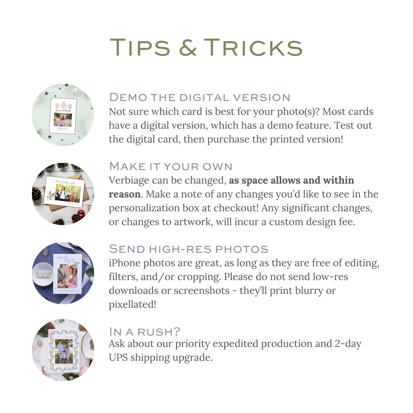 This Christmas card is sized 5x7, and printed on thick 120 lb eggshell cover cardstock. Cards come with matching white square-flap envelopes. If you would like any extras such as envelope liners or return/recipient addressing, please contact me to purchase the additional listing for those upgrades.