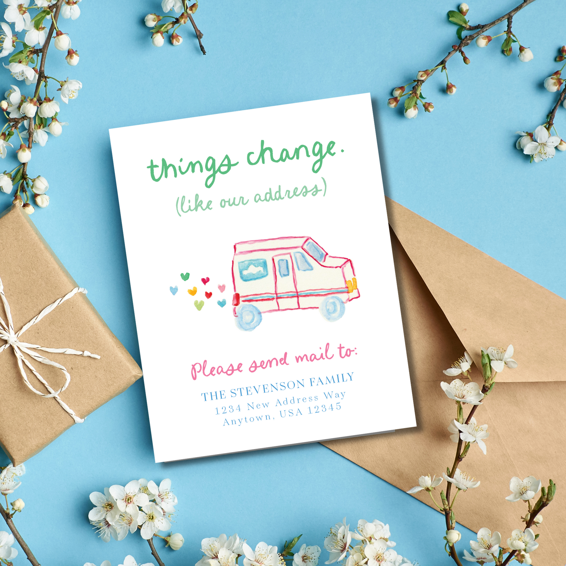 Make sure everyone knows your new address with these whimsical watercolor mailbox moving announcement cards! Featuring exclusive, hand-painted watercolor artwork, these address change cards are the perfect housewarming gift or realtor gift!