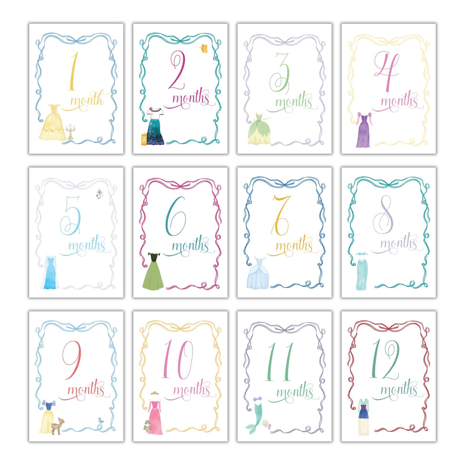 Chronicle your baby's growth with this adorable watercolor princess monthly milestone card set from Emilemon Paper Studio! Featuring a different princess each month, these baby girl milestone cards are the perfect baby shower gift for your little princess!