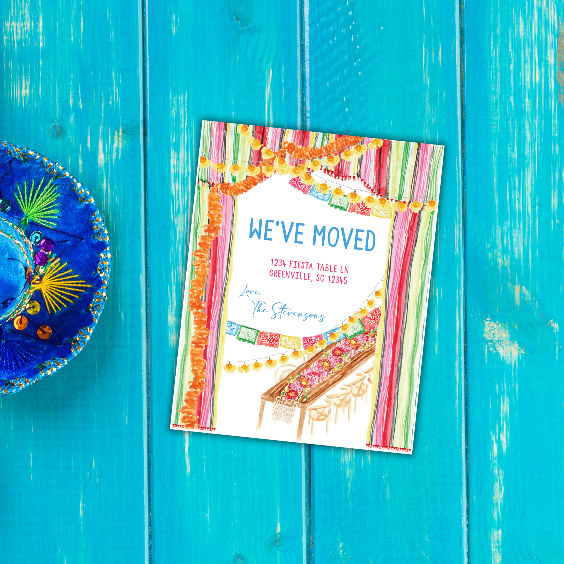 Make sure everyone knows your new address with these stunning watercolor serape fiesta-themed moving announcement cards from Emilemon Paper Studio! Featuring exclusive hand-painted watercolor artwork, these are the perfect change of address cards to celebrate your move!