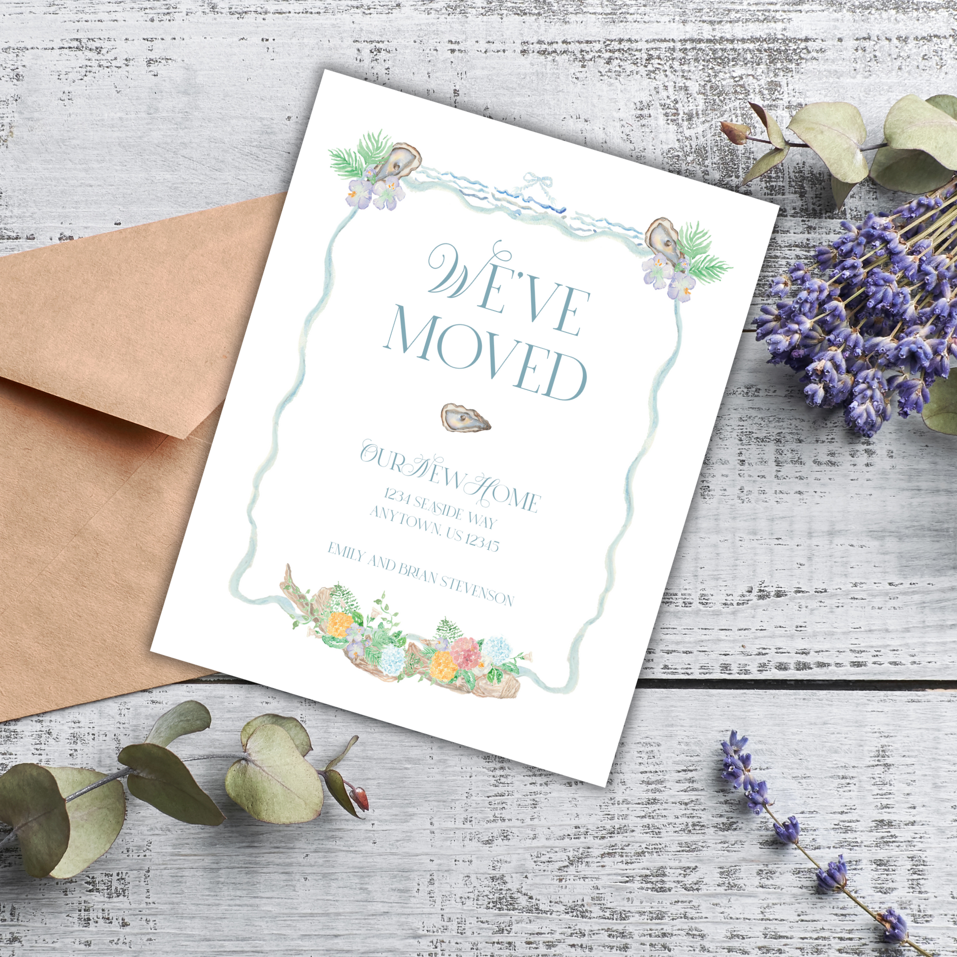 Make sure everyone knows your new address with these watercolor seaside moving announcement cards! Featuring exclusive, hand-painted watercolor artwork, these new home by beach announcements are the perfect "we've moved" cards!