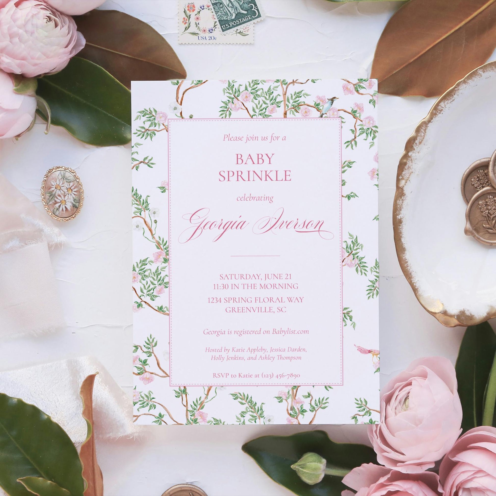 Celebrate the mama-to-be in style with this stunning watercolor spring chinoiserie floral baby shower invitation from Emilemon Paper Studio! Featuring exclusive, hand-painted watercolor artwork, these grandmillennial baby shower invites are perfect for a "baby in bloom" shower!