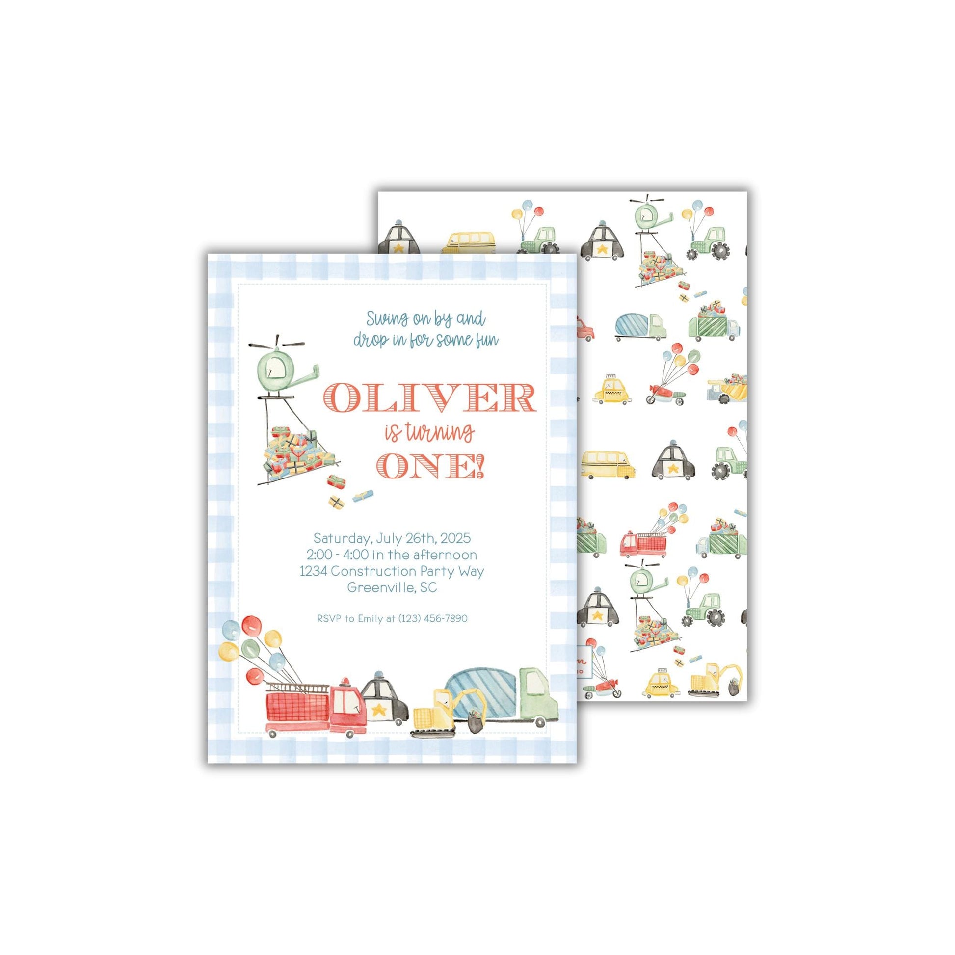 Celebrate your little one in style with this stunning watercolor vehicle party invitation from Emilemon Paper Studio! Featuring exclusive, hand-painted watercolor artwork, this gingham construction invitation is the perfect classic boy first birthday invitation!